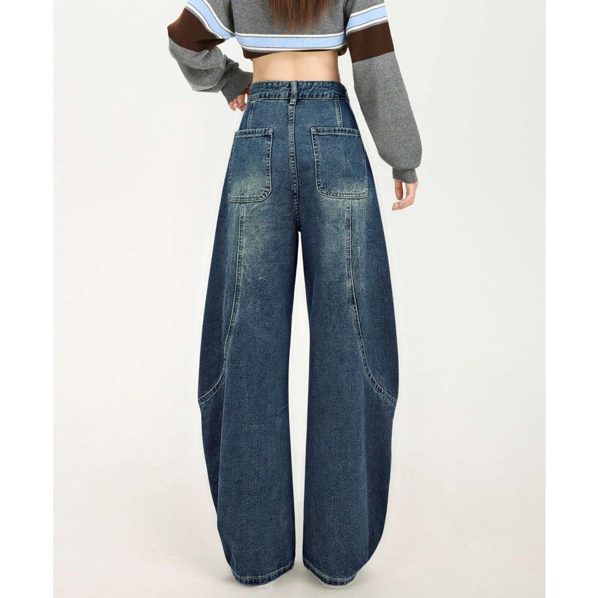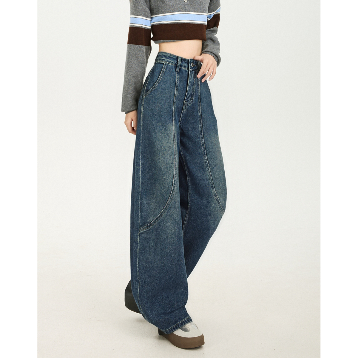 三福牛仔长裤2025新款冬季磨毛阔腿裤复古深色宽松裤子女装512304