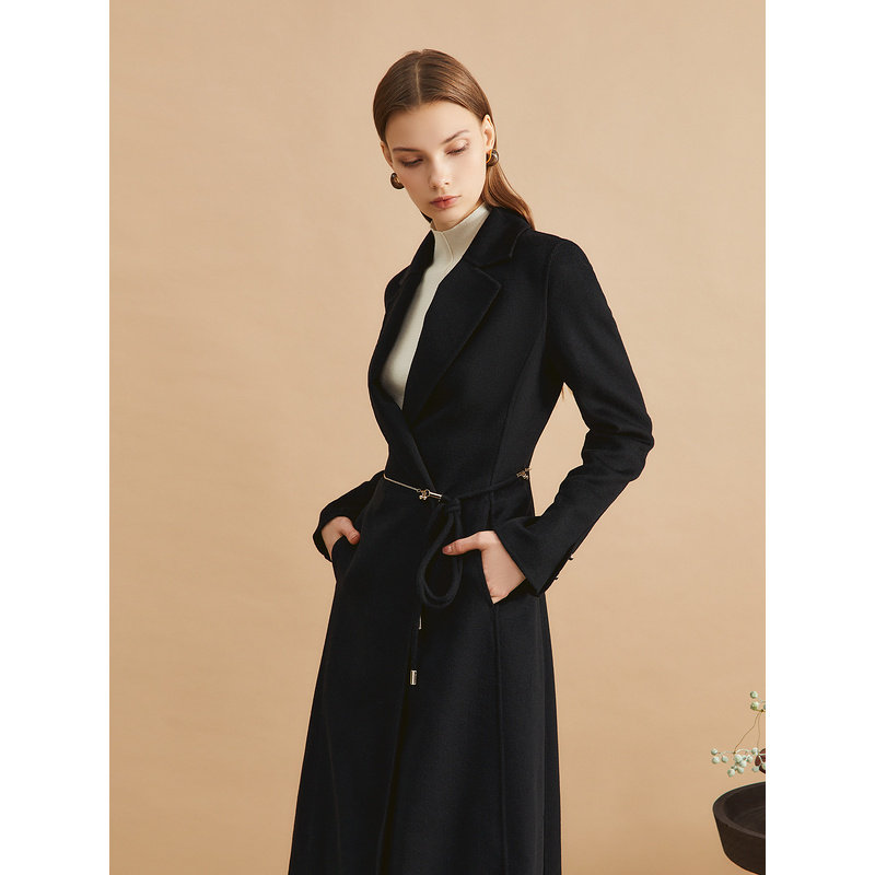 YINER音儿女装冬季法式长款系带收腰羊毛羊绒混纺双面呢大衣外套