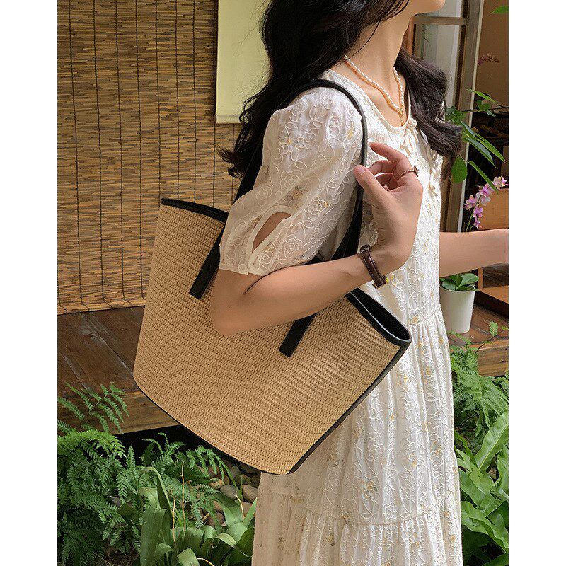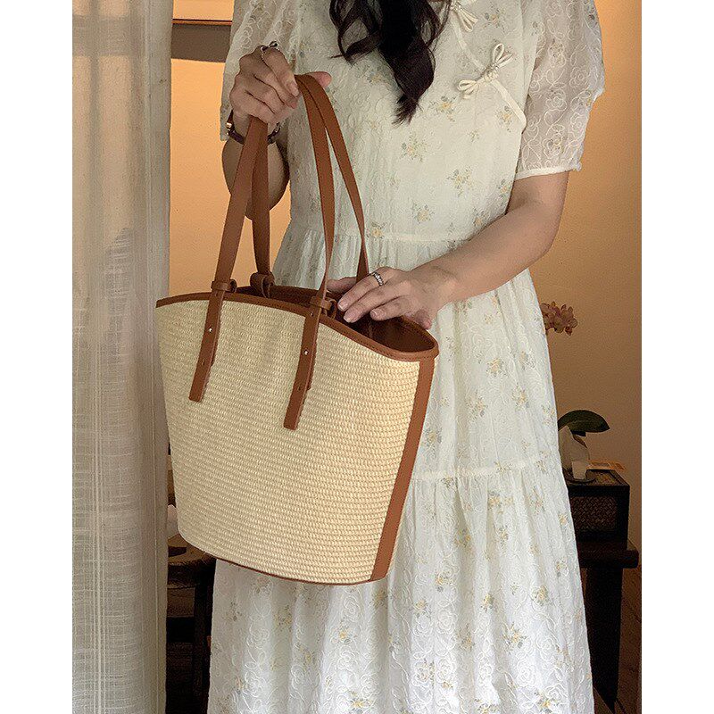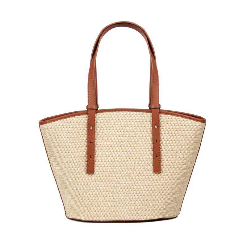 大容量腋下托特包2024新款时尚草编配皮编织包包小V众单肩包女大