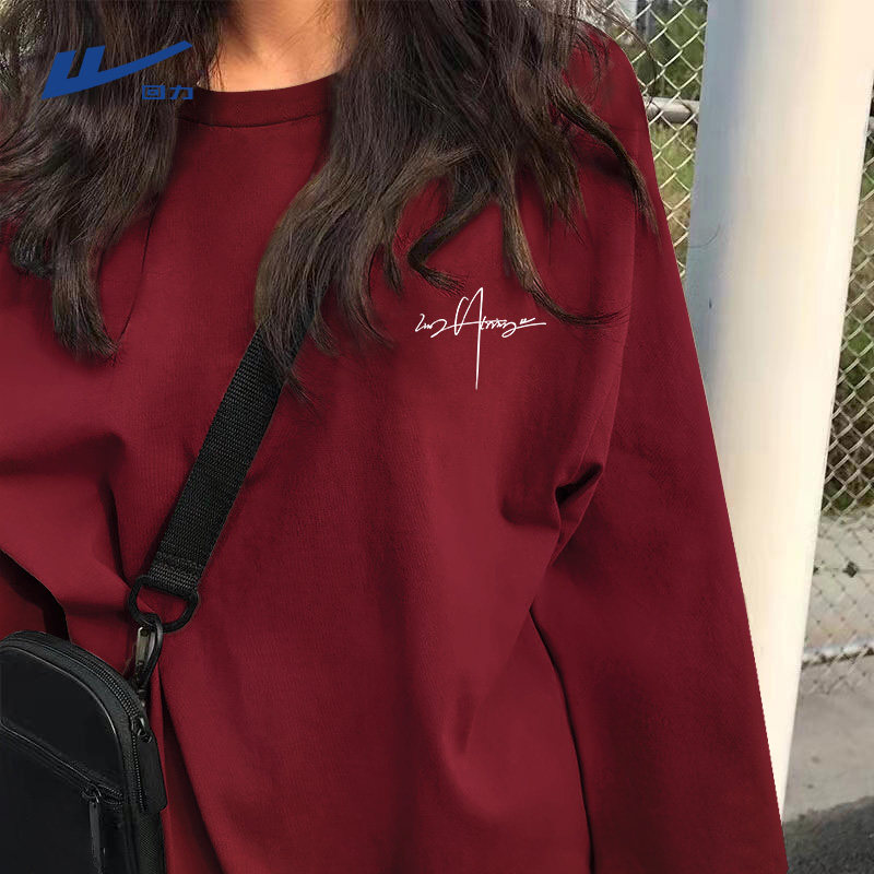 回力酒红色t恤男女同款重磅纯棉长袖马年本命年衣服宽松正肩短袖Y