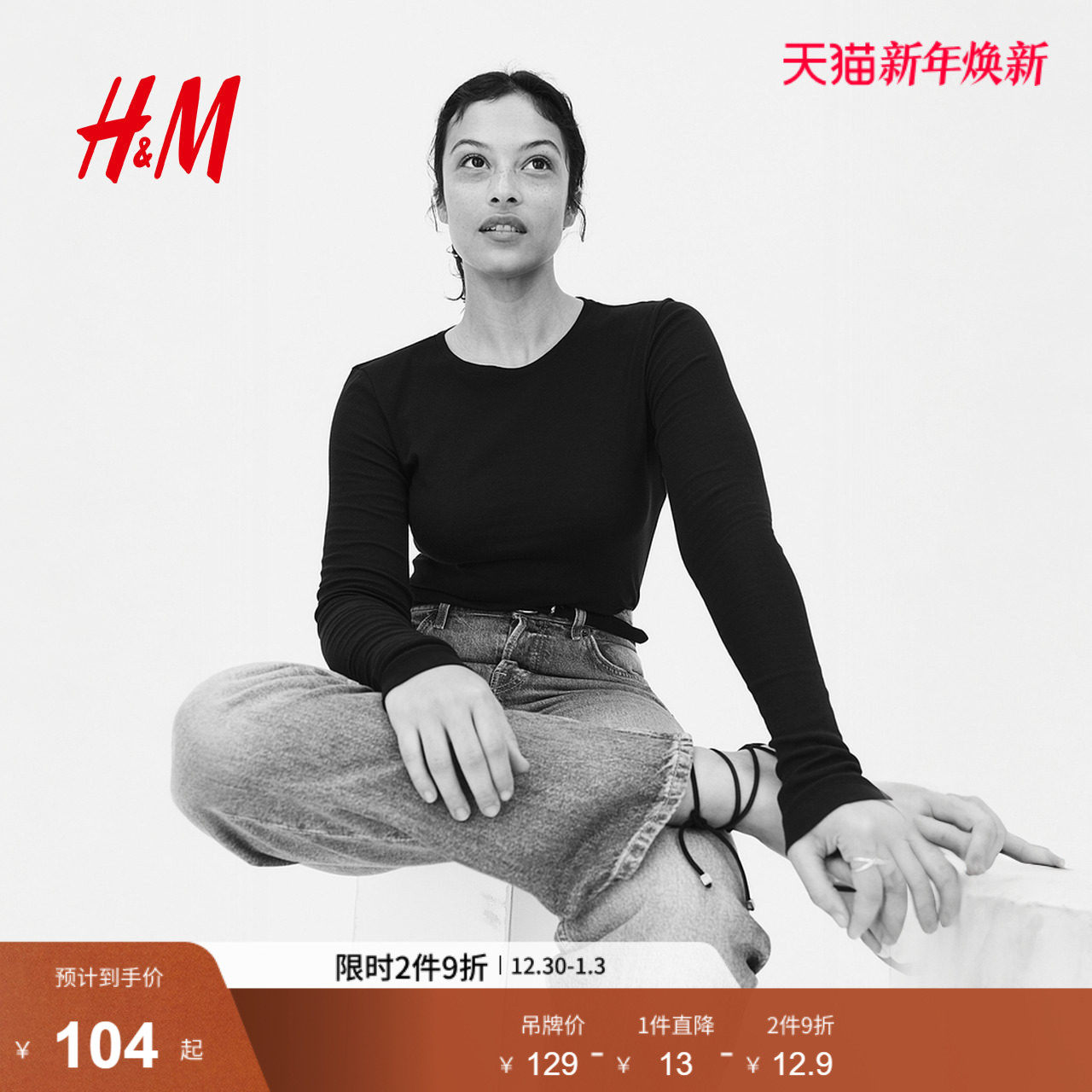 HM女装T恤冬季时尚气质修身打底棉质长袖圆领上衣1266888