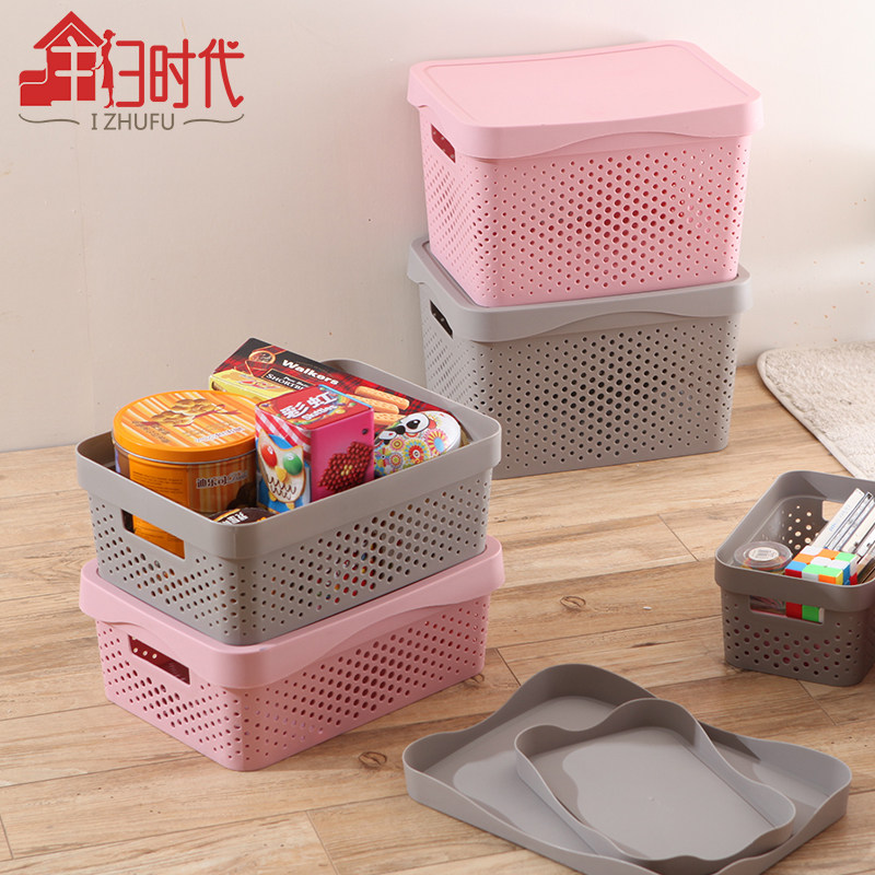 带盖塑料收纳筐桌面杂物整理盒家用衣柜储物箱镂空玩具收纳篮子