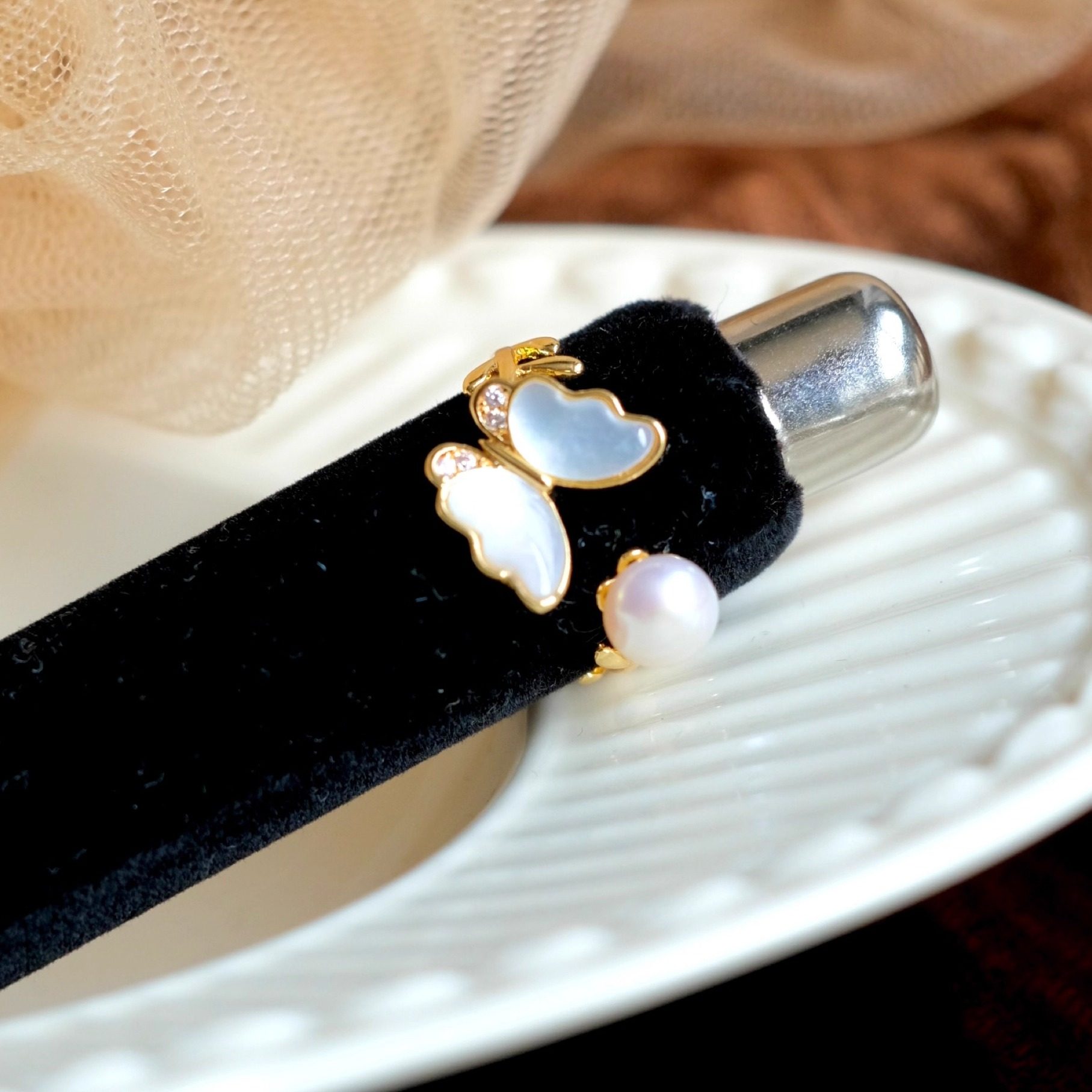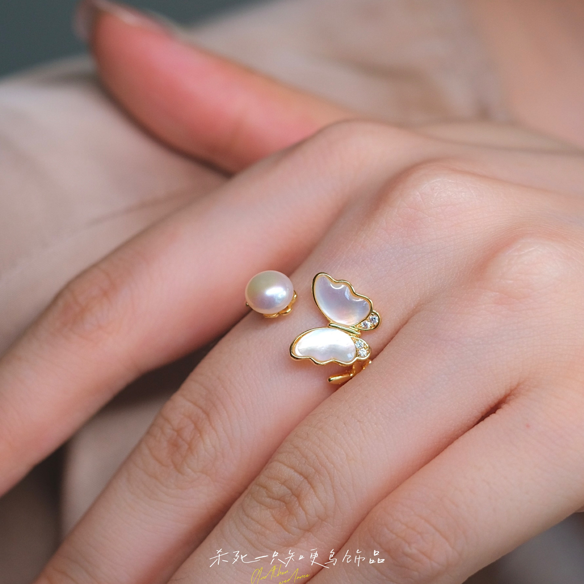 《蝴蝶衔珠》法式复古精致轻奢天然白贝母淡水珍珠开口戒指可调节