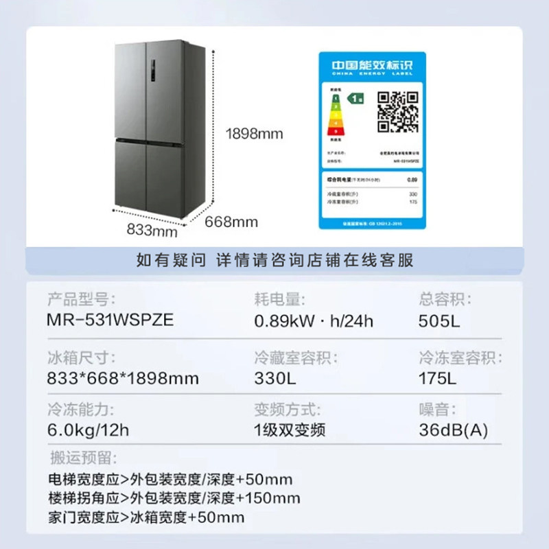 【全国补贴】美的531电冰箱十字门家用变频一级能效风冷无霜官方