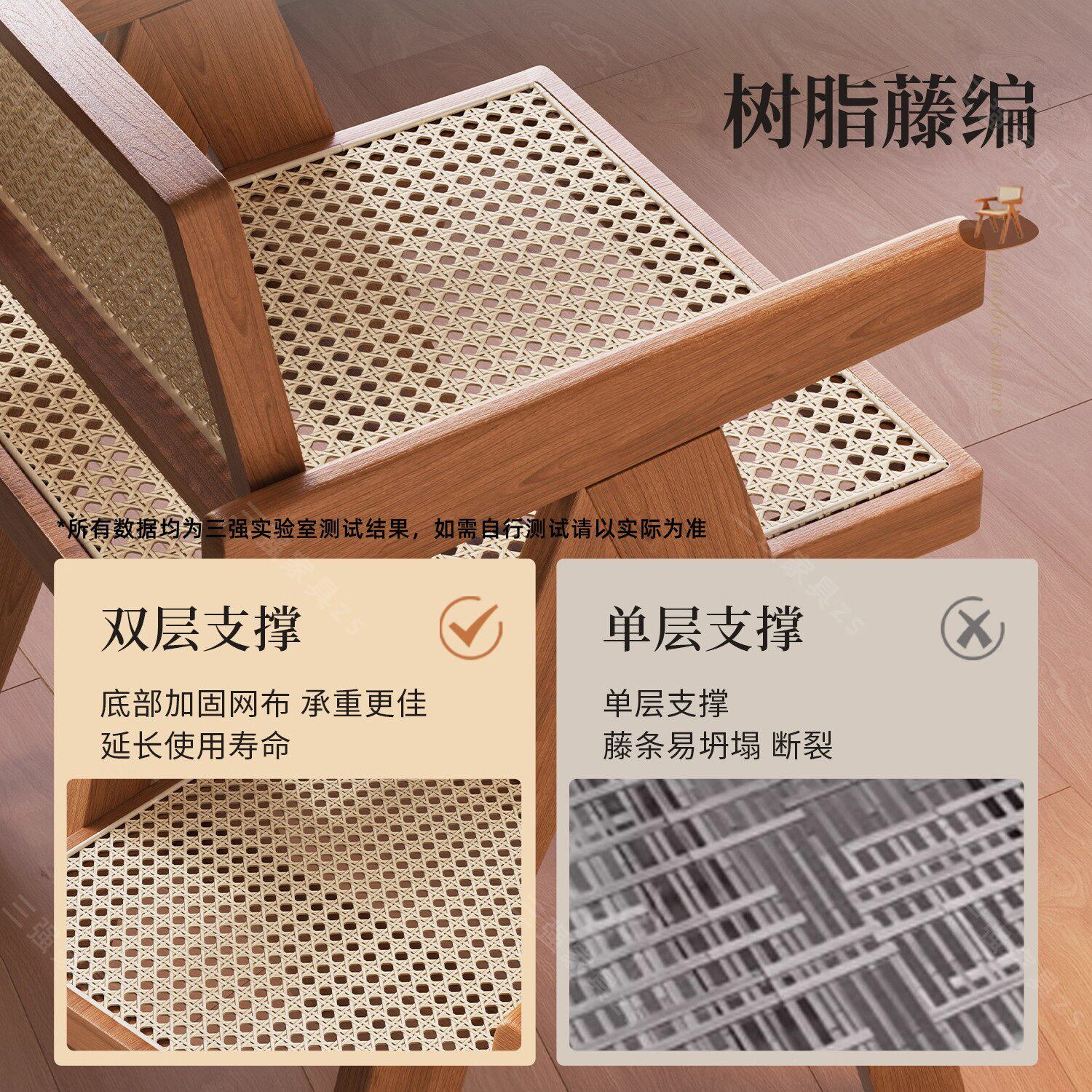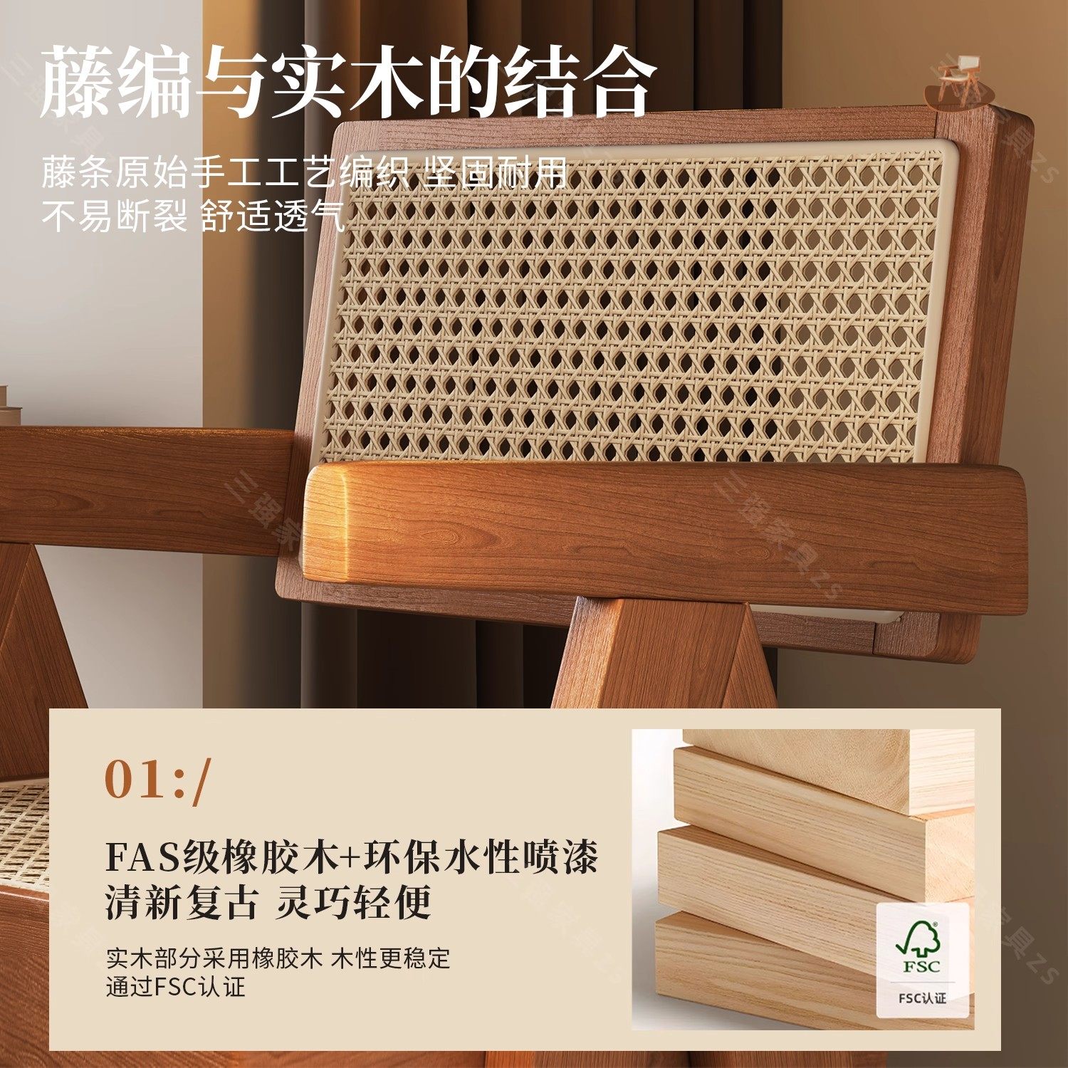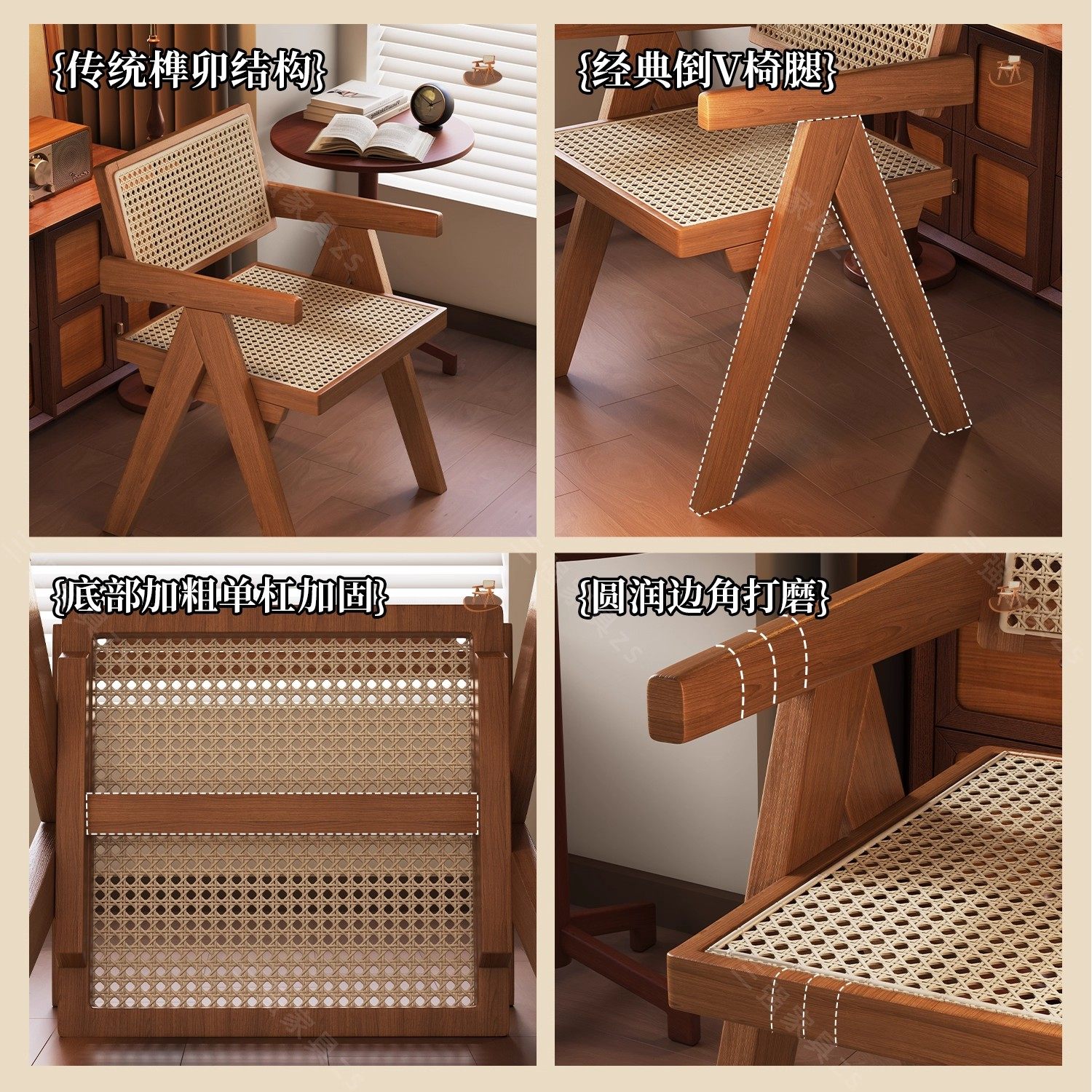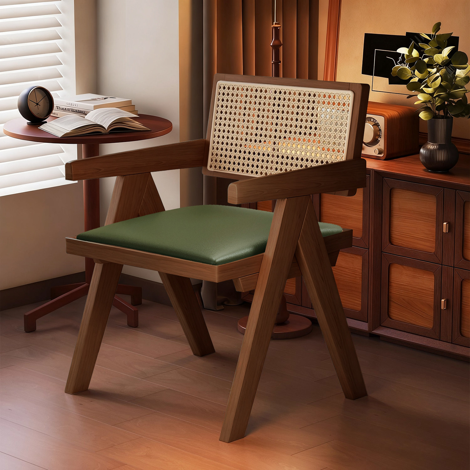 实木餐椅家用中古风昌迪加尔靠背椅侘寂风藤编椅子书房原木色软包