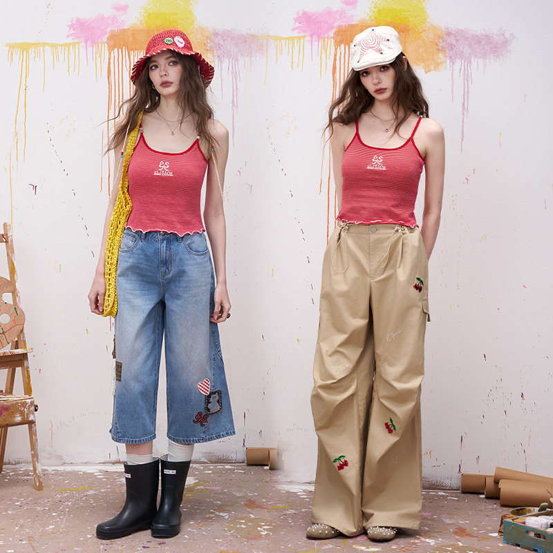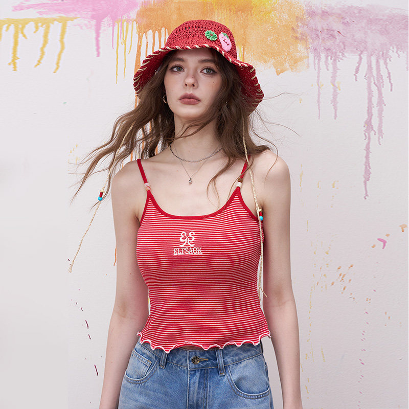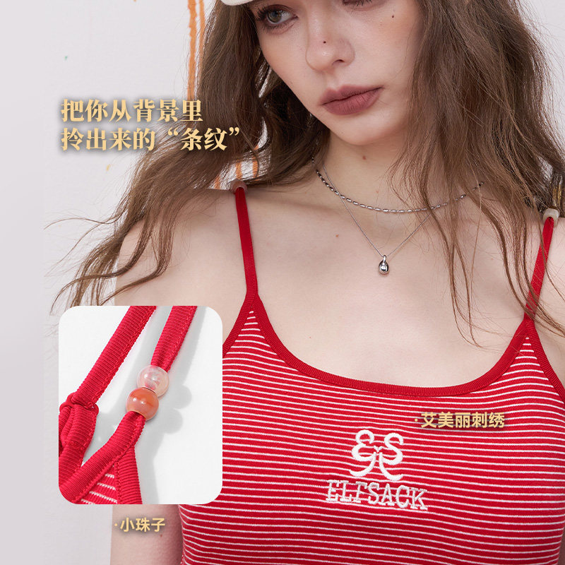 妖精的口袋蝴蝶结刺绣红色条纹吊带女2026春夏新款木耳边内搭背心