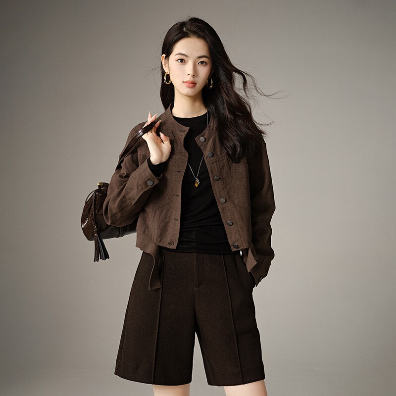 晚白2026年春新款立领莱赛尔亚麻上衣百搭休闲大码短夹克外套女