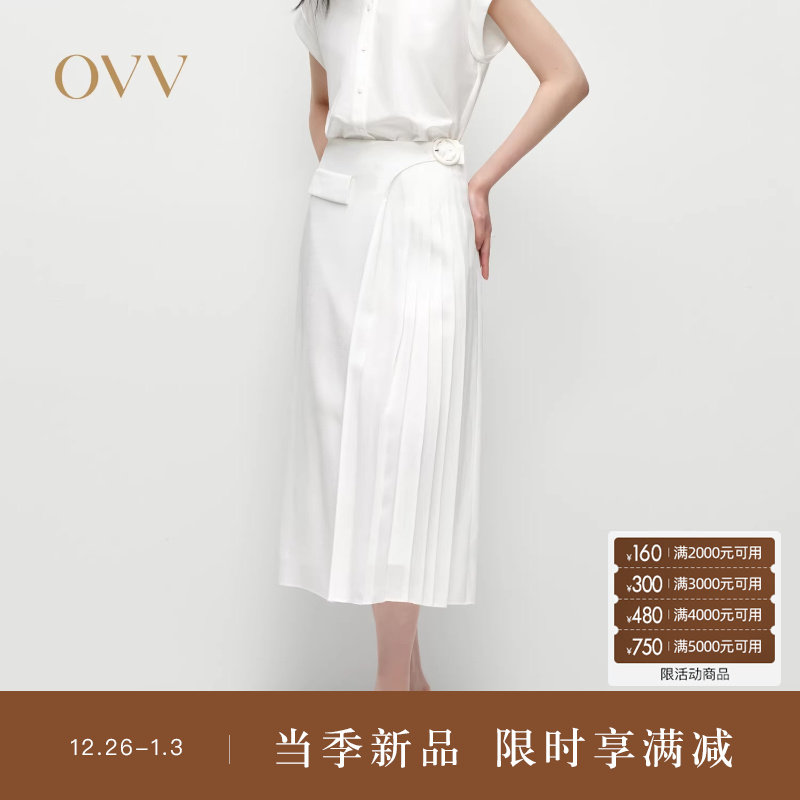 OVV2025春夏新款女装淡人醋酸仿麻拼接百褶裙简约易搭半身裙