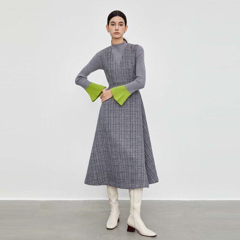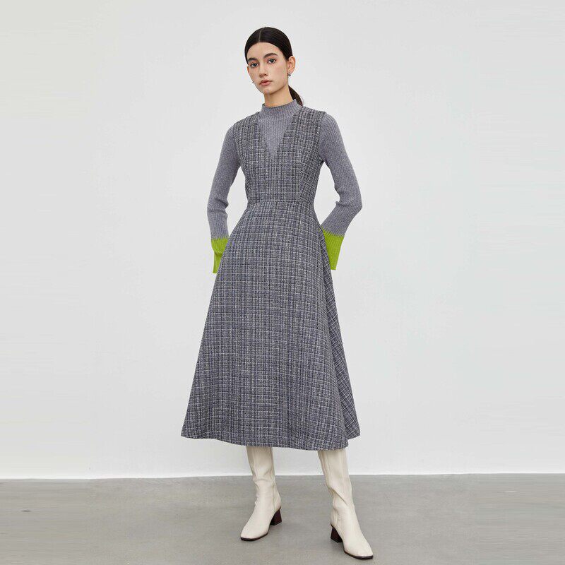 V领连衣裙 撞色格纹 不规则摆