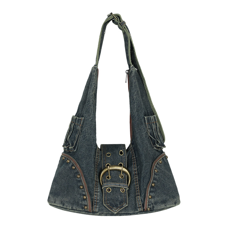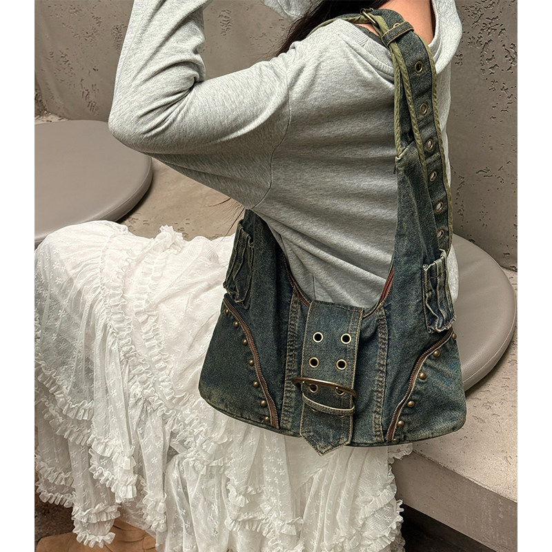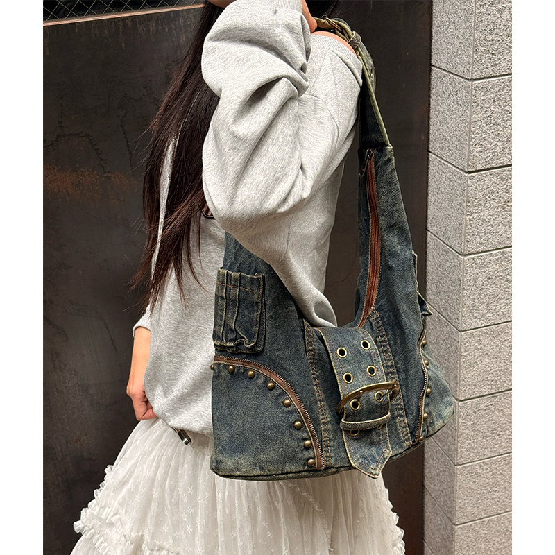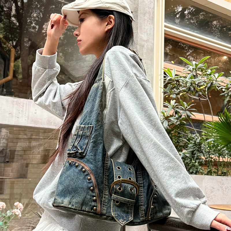 妖精的口袋美式重工复古铆钉水洗牛仔包女2026新款甜酷单肩斜挎包