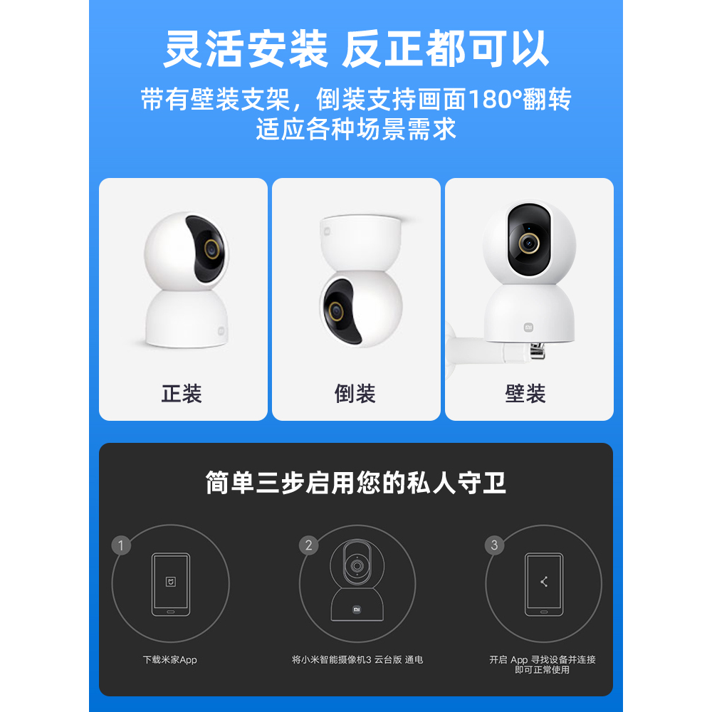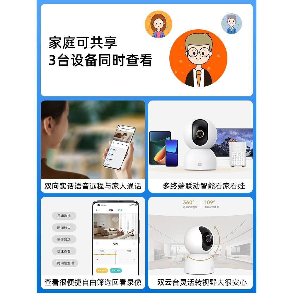 小米智能摄像机3云台版摄像头家用手机远程摄影头360度500W像素全景高清夜视网络摄像机室内家庭监视器监控头