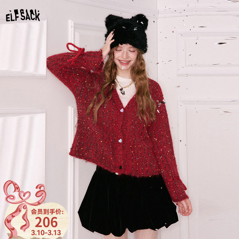 妖精的口袋彩色亮片v领红色毛衣女2026冬新款氛围感甜美开衫外套