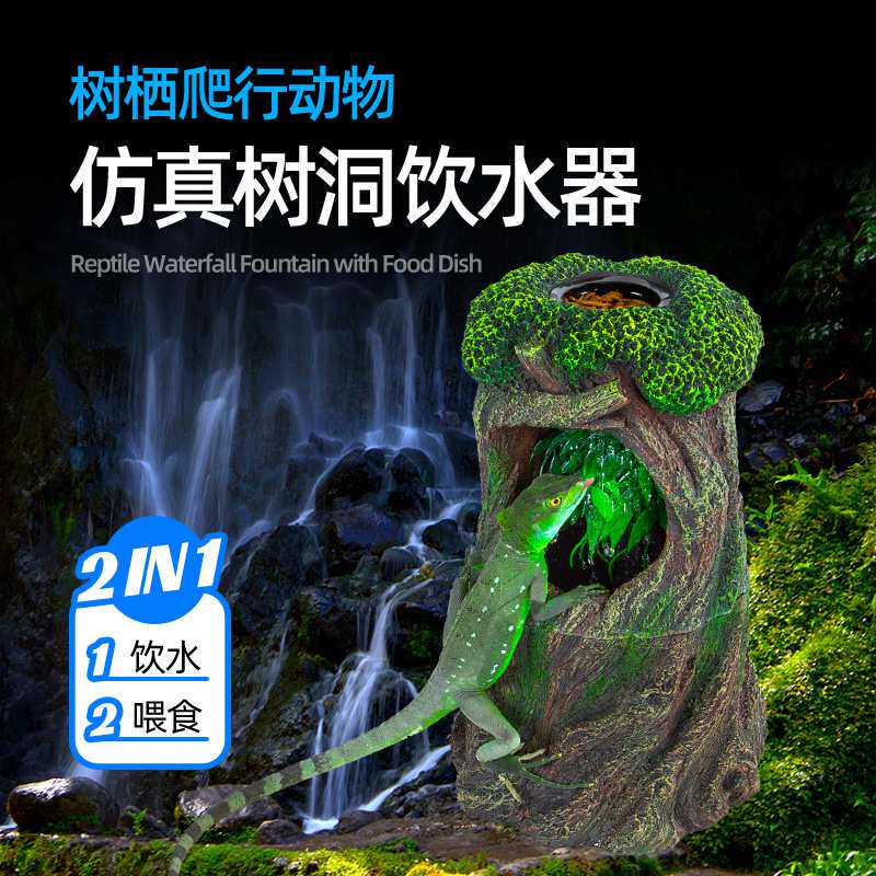 Reptizoo爬宠变色龙树蛙饮水器蜥蜴仿真树洞树脂二合一喂食饮水器