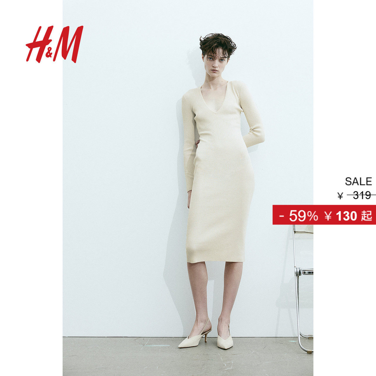 HM女装连衣裙冬季优雅V领裹身长袖连衣针织中长裙1216339