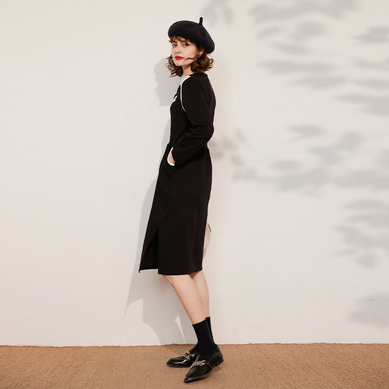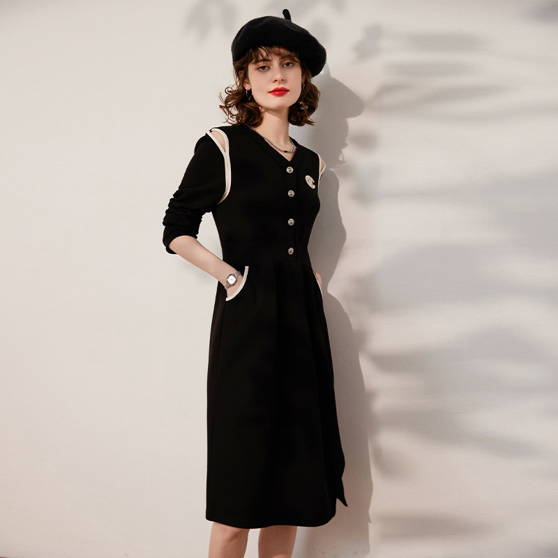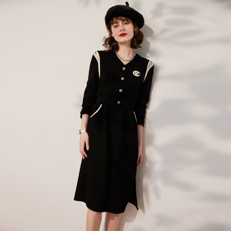 白鹿语撞色单排扣绣花连衣裙2025春款创意镂空落肩气质休闲中长裙