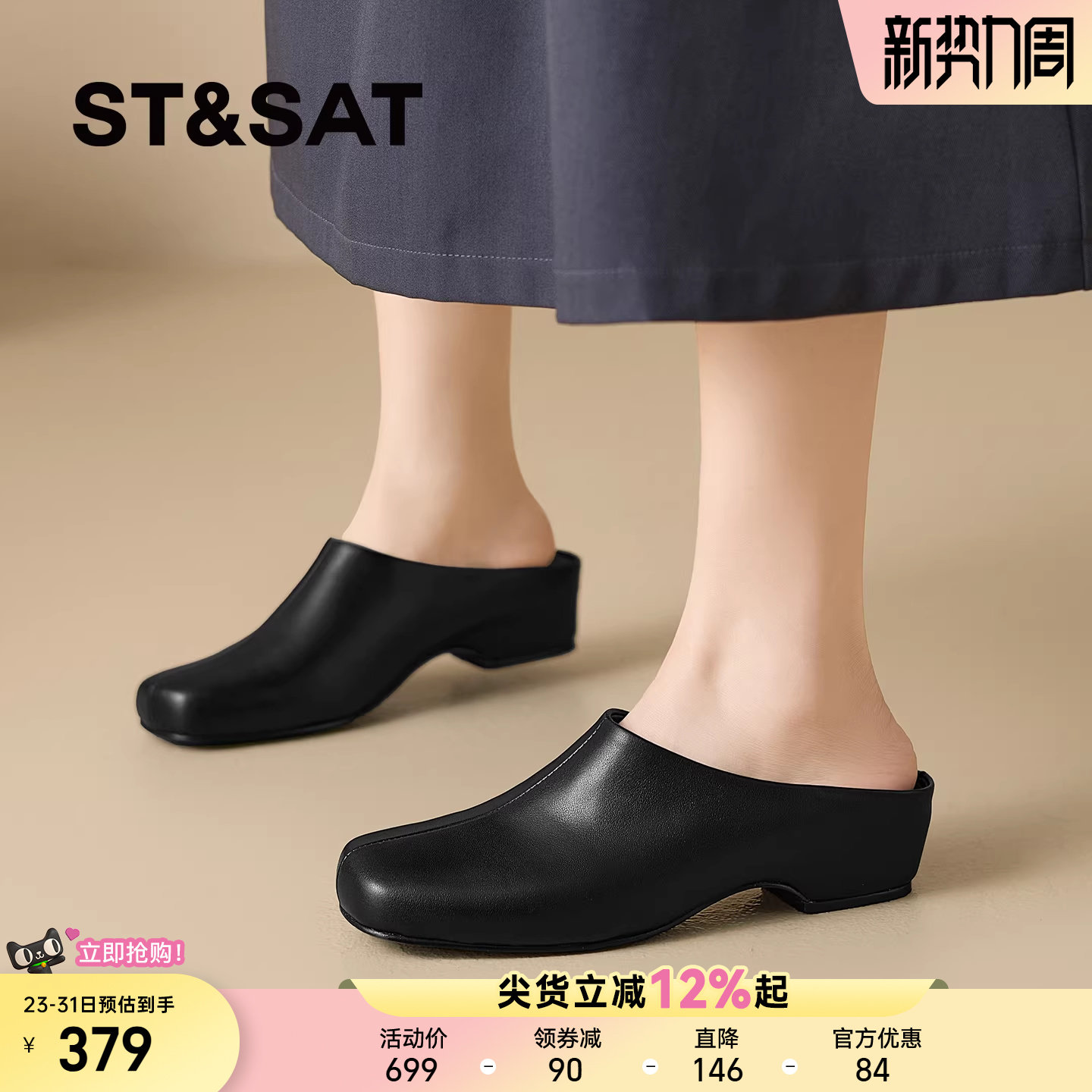 星期六简约风包头拖鞋女2026夏新款真皮方头外穿软底穆勒鞋坡跟拖