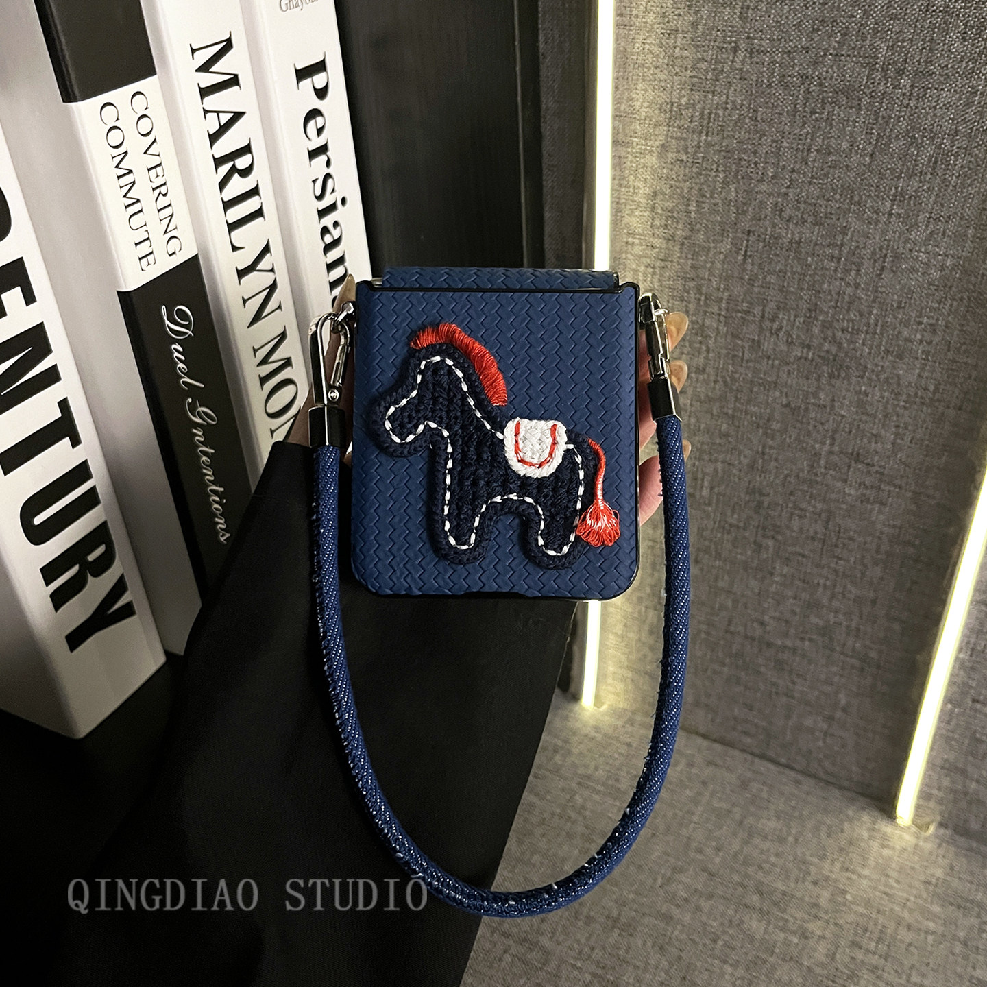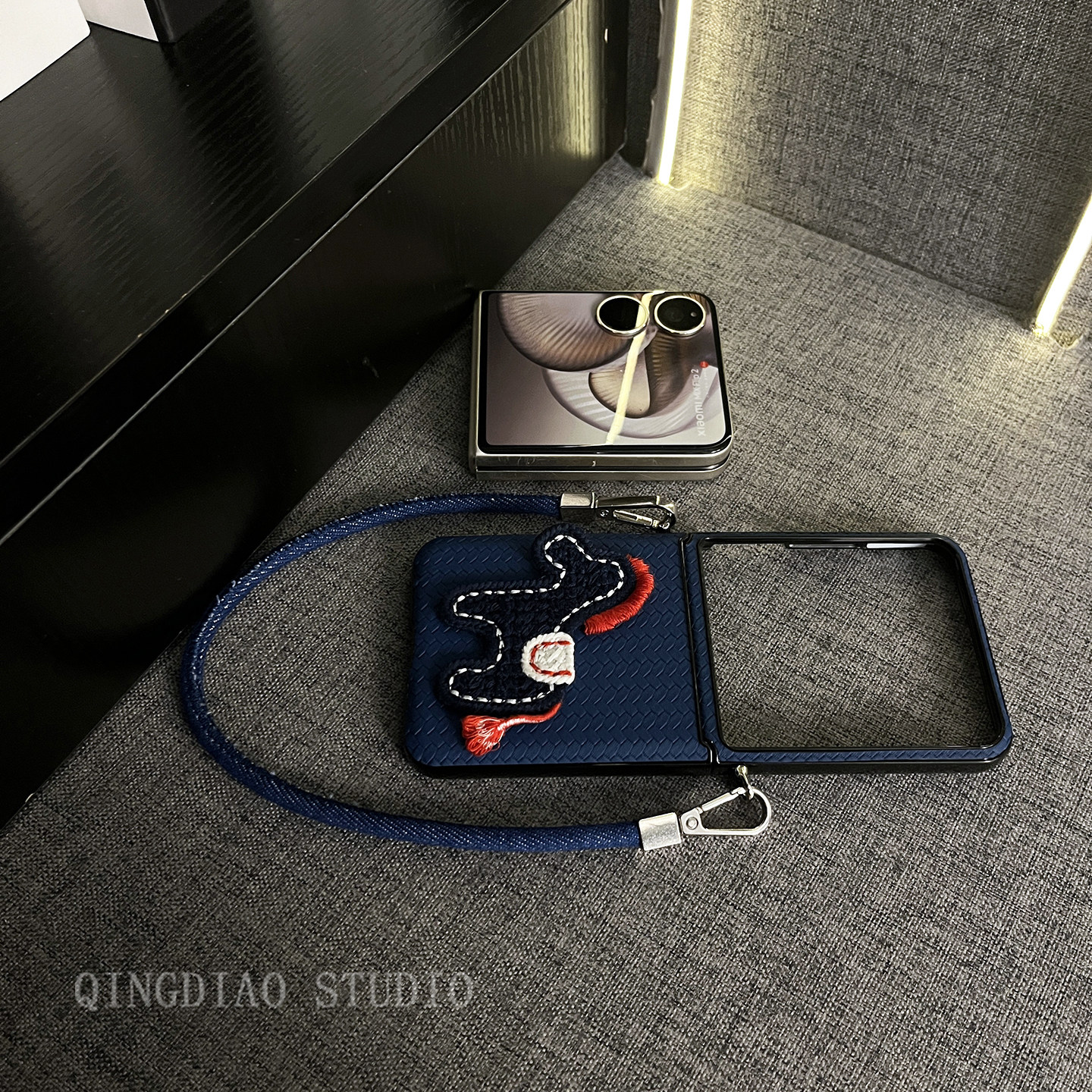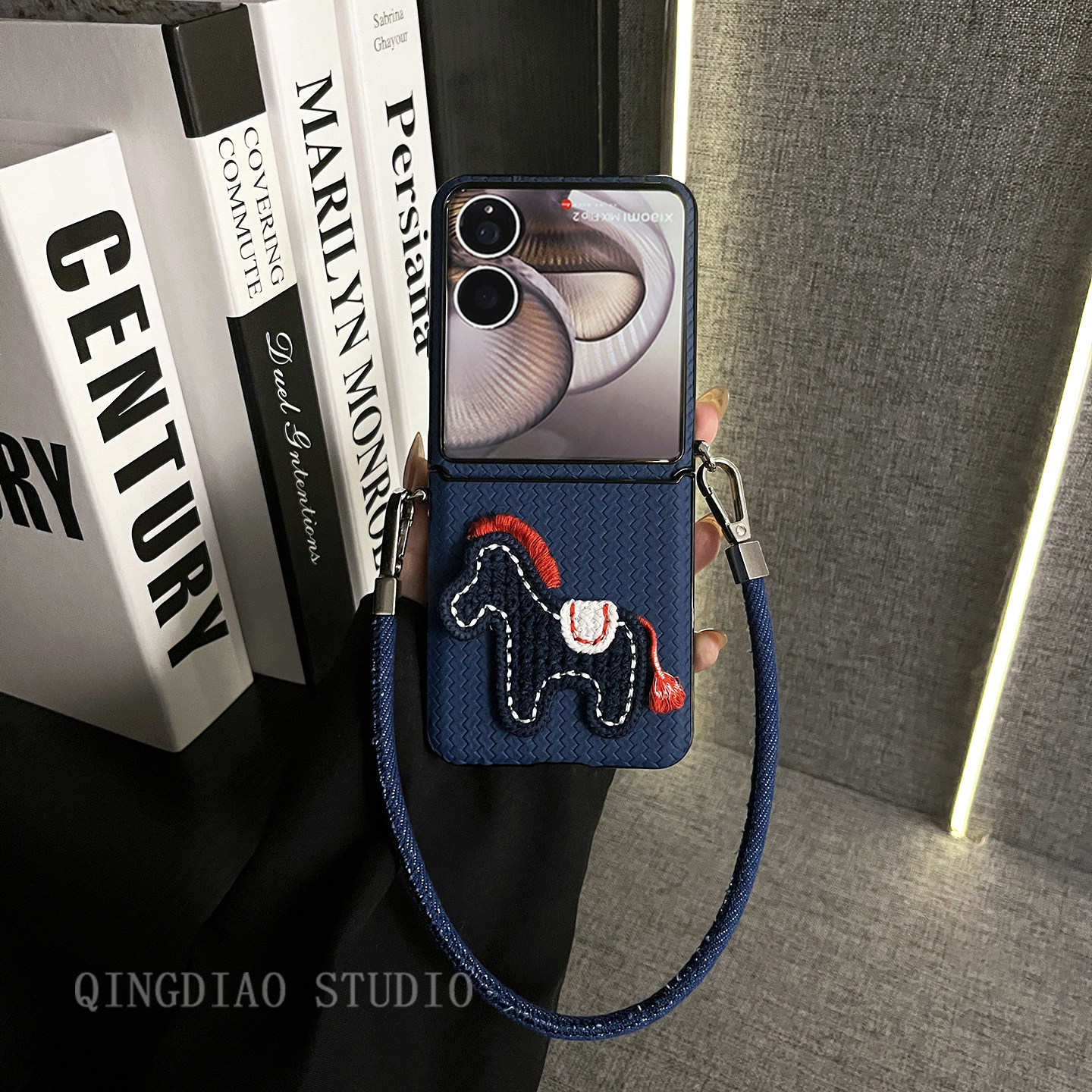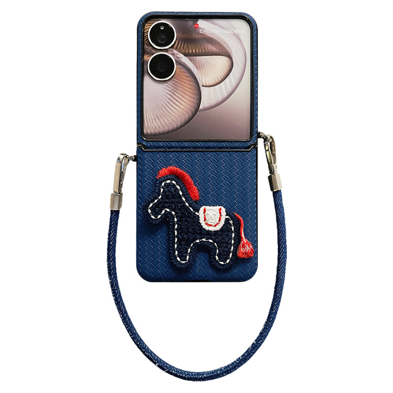 轻调 日韩深蓝草席纹针织马牛仔手提绳适用于小米MIX Flip2手机壳全包新款MIX限量版flip折叠屏翻盖防摔外壳
