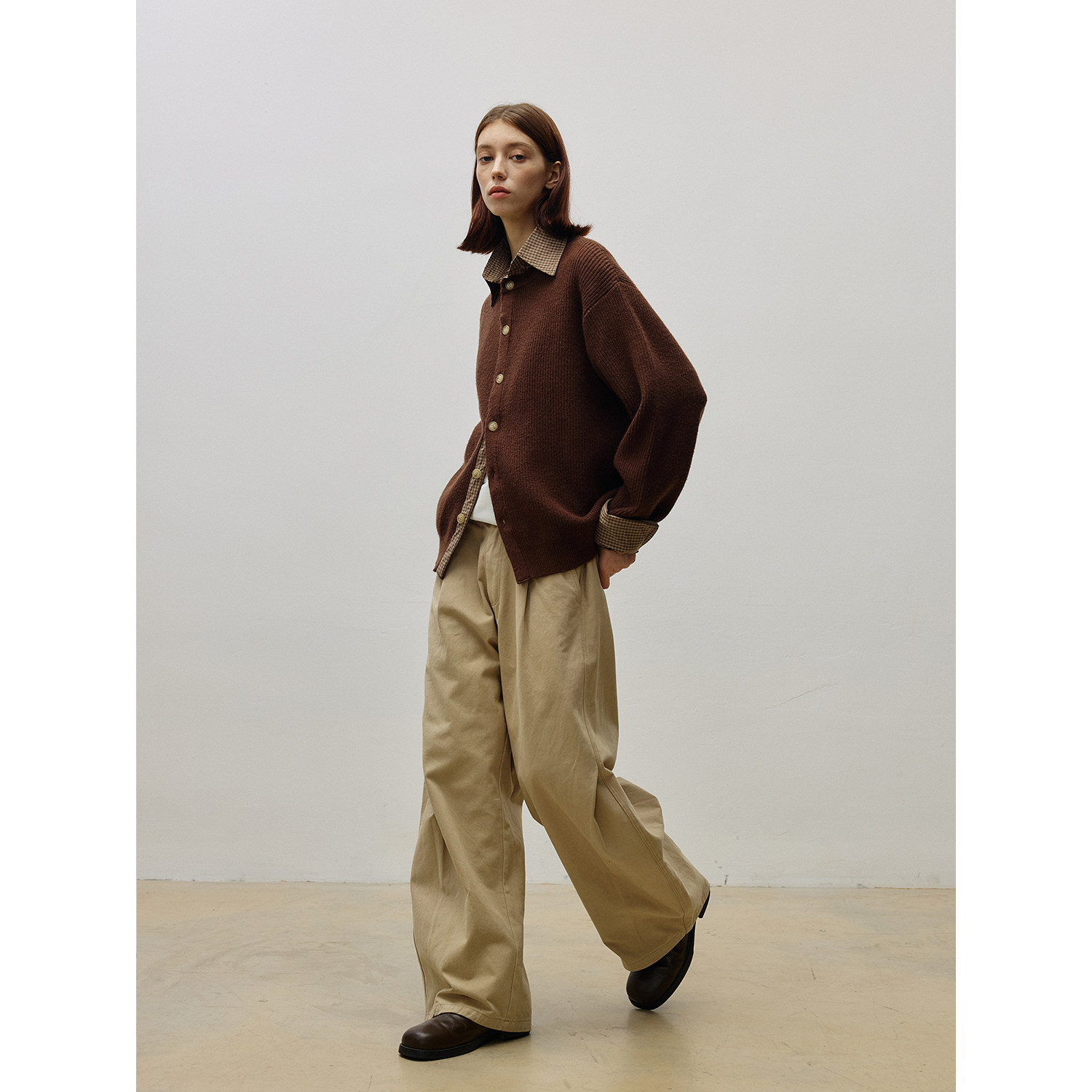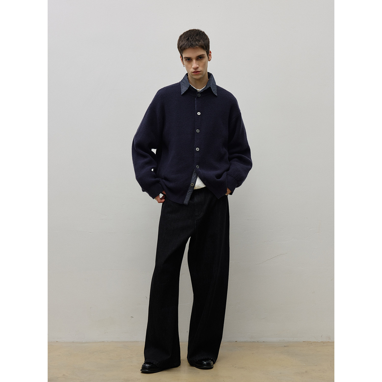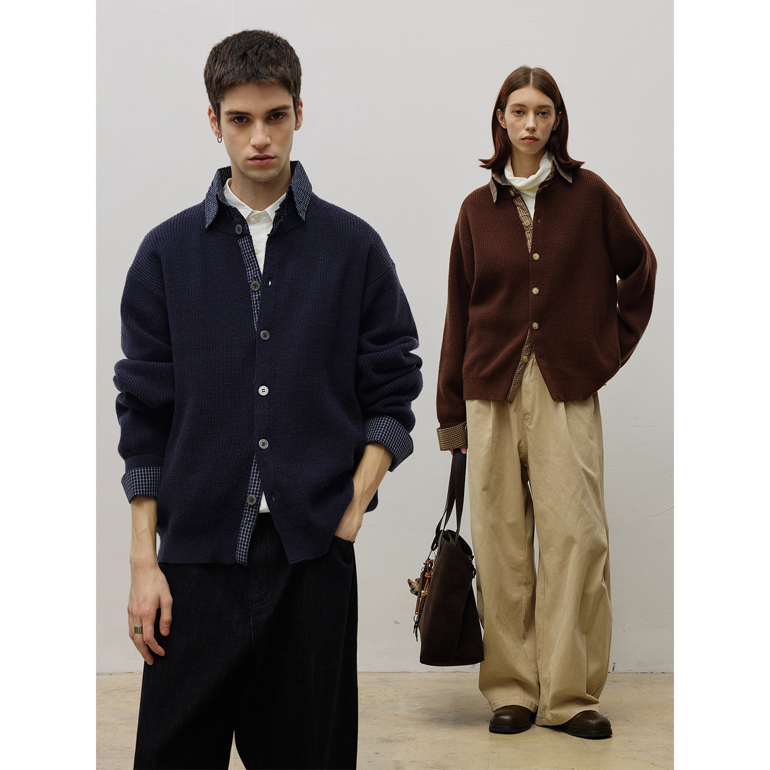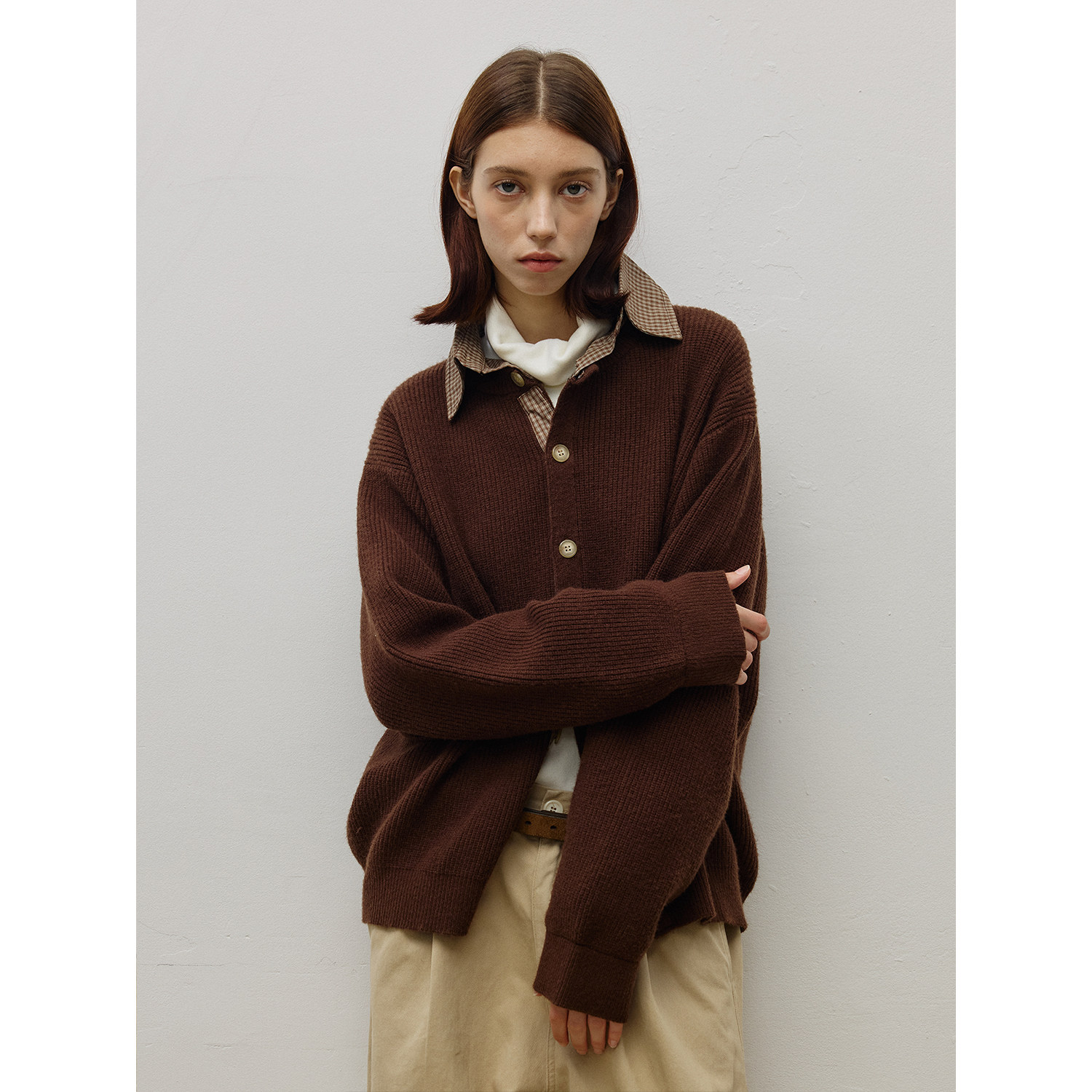 LR MADE 25AW 撞色拼接格纹布 假两件翻领绵羊毛保暖针织毛衣开衫