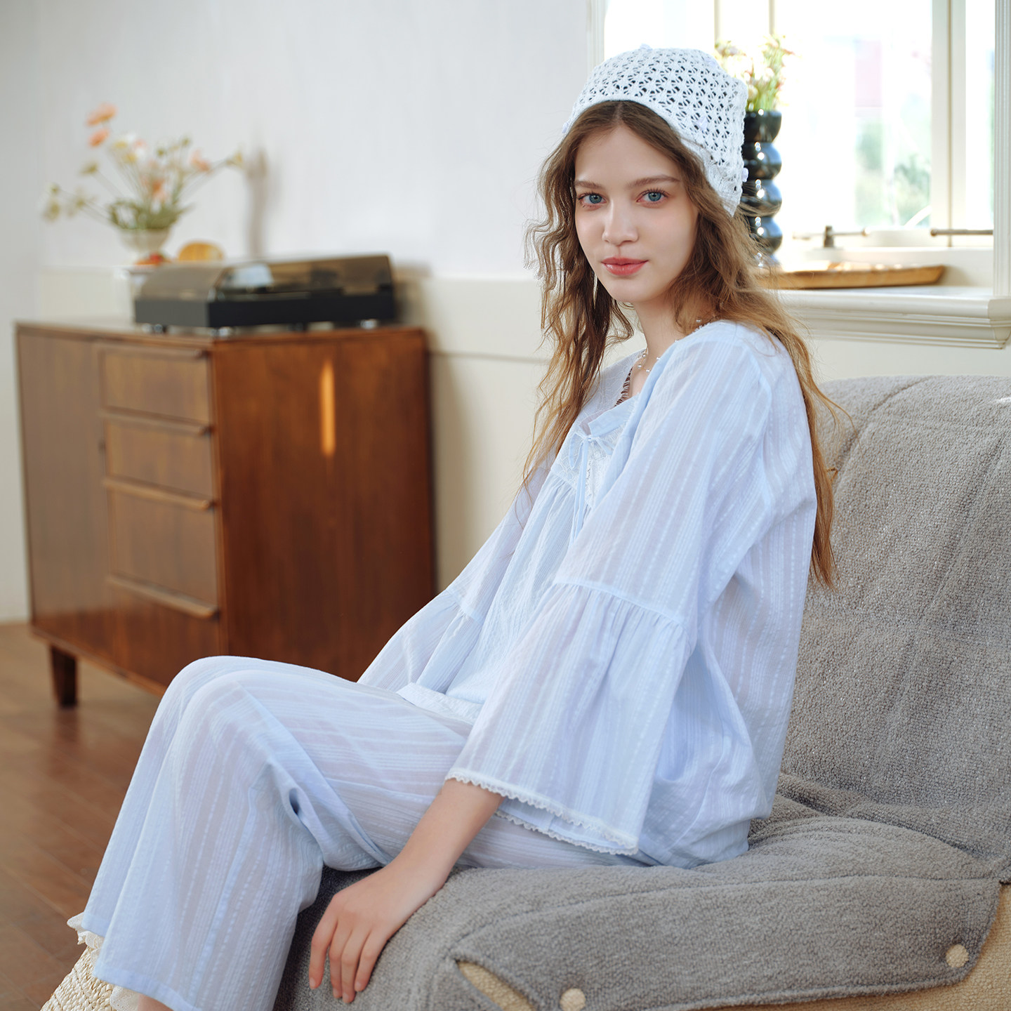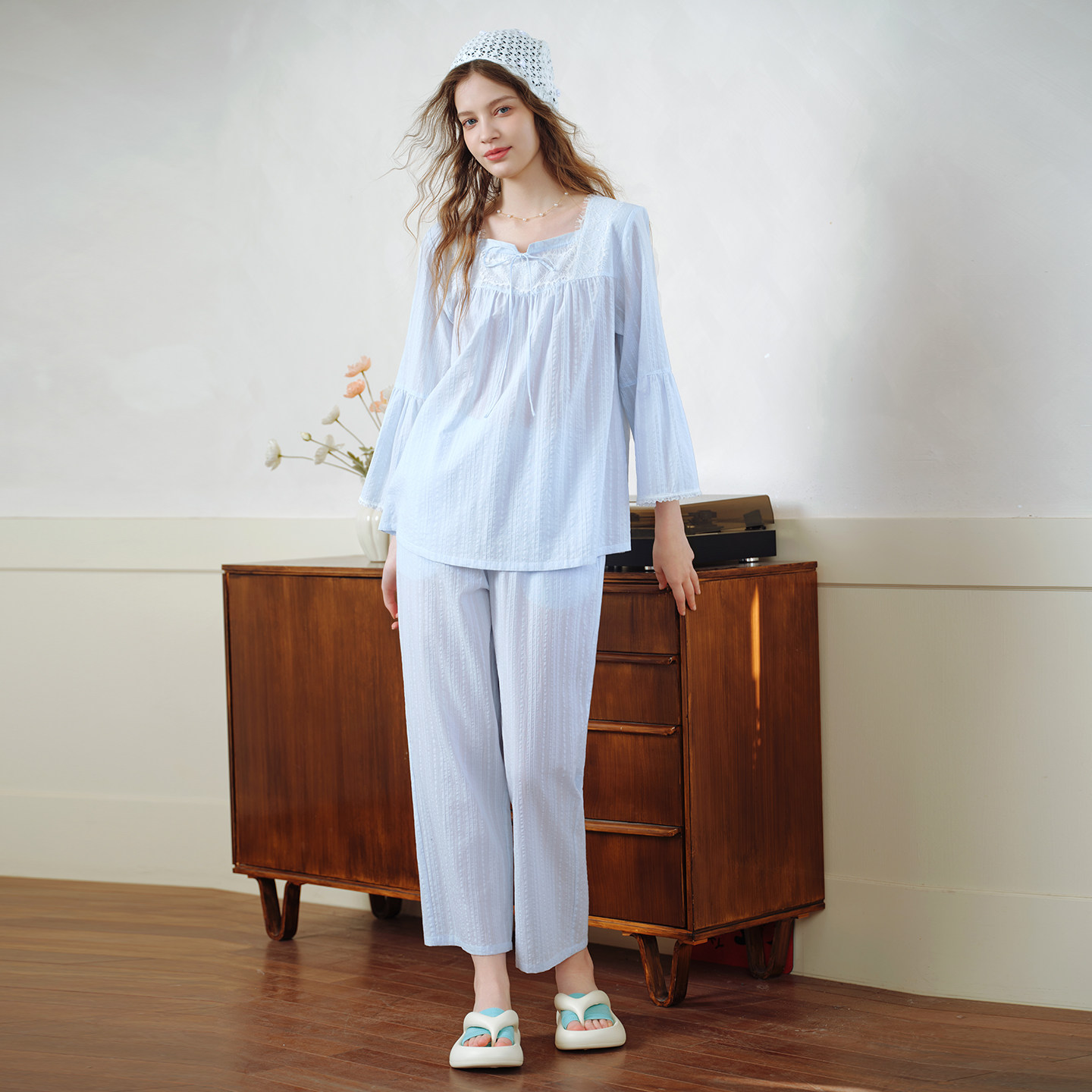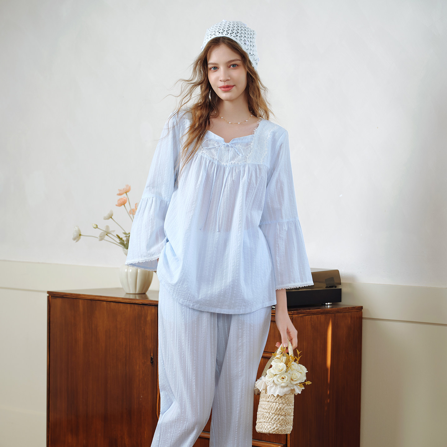 美标新款长袖纯棉睡衣套装女春夏蕾丝花边公主风甜美全棉家居服秋