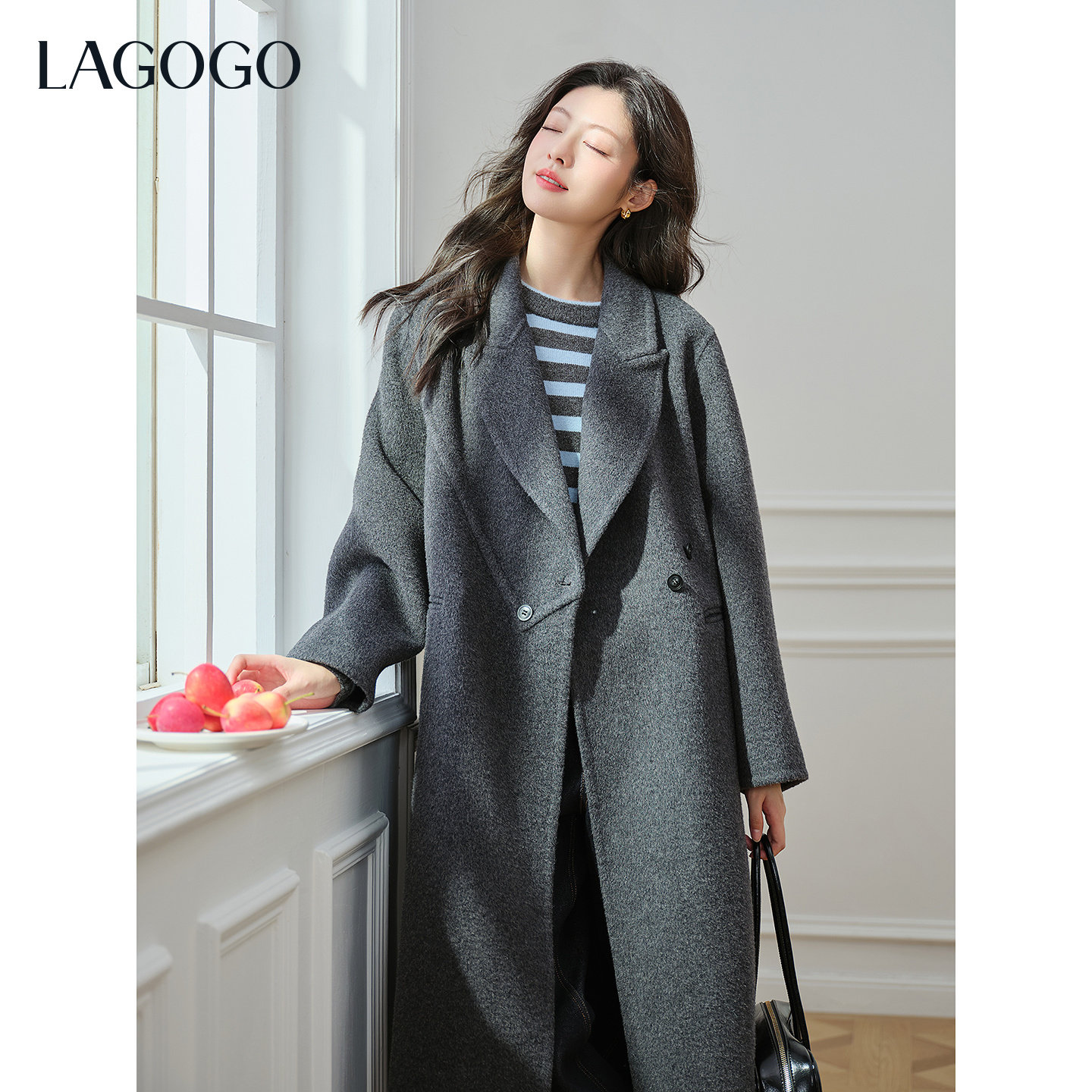 【100%羊毛】LAGOGO深灰毛呢大衣女拉谷谷2025年冬新款长款外套