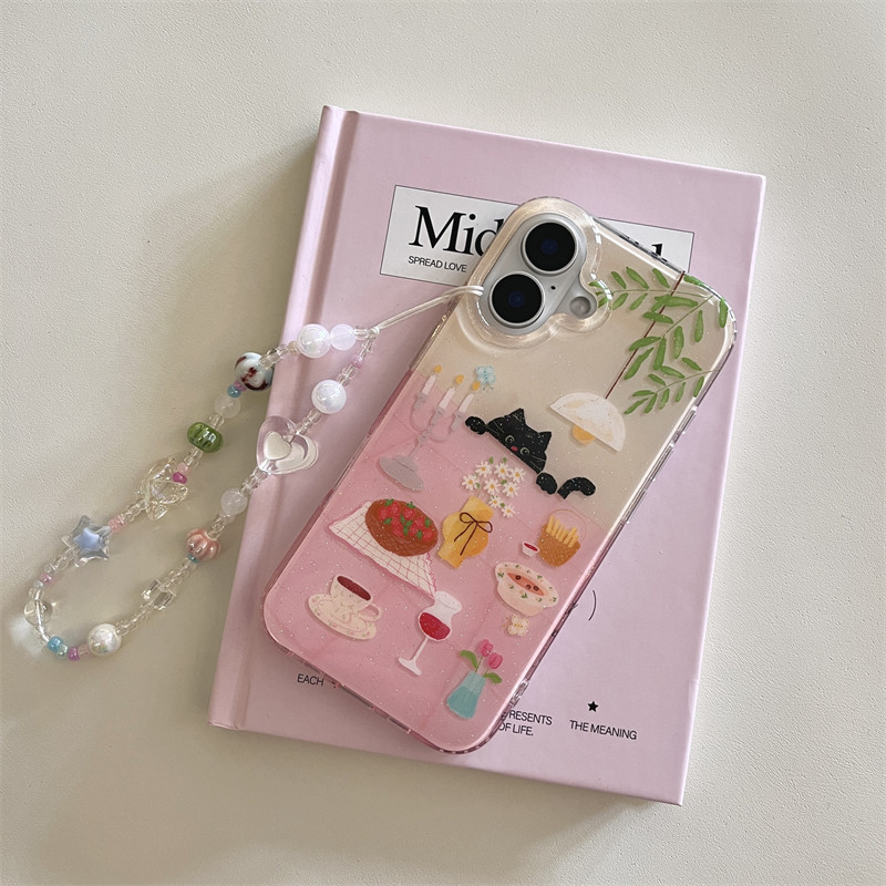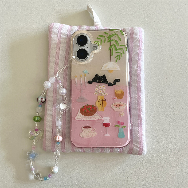 韩风ins小众高级感少女软萌可爱粉色闪粉餐桌小黑猫手链16promax适用iphone15pro双层14手机壳苹果13保护套