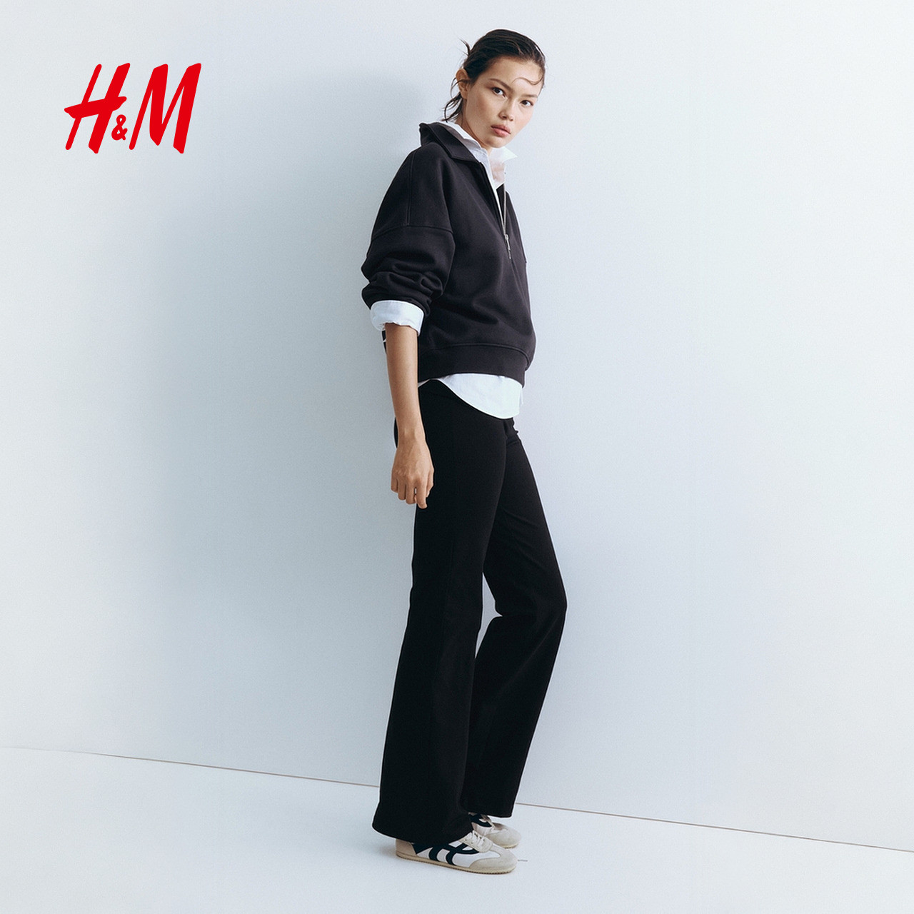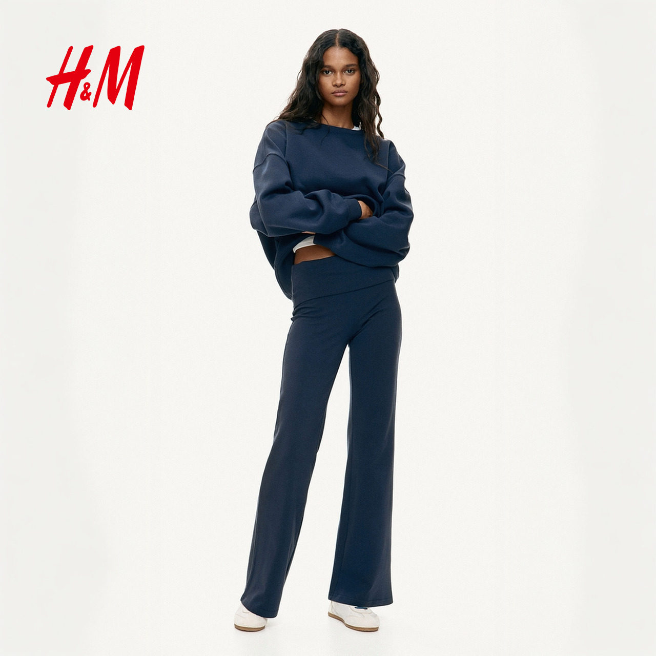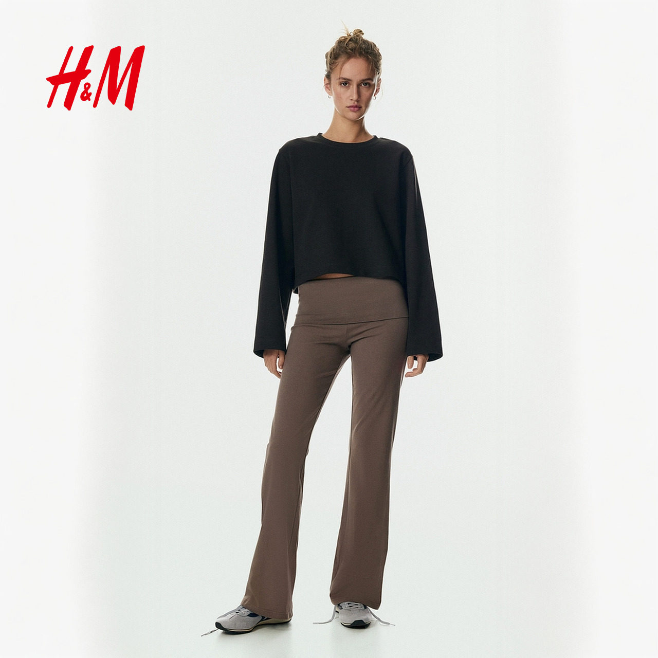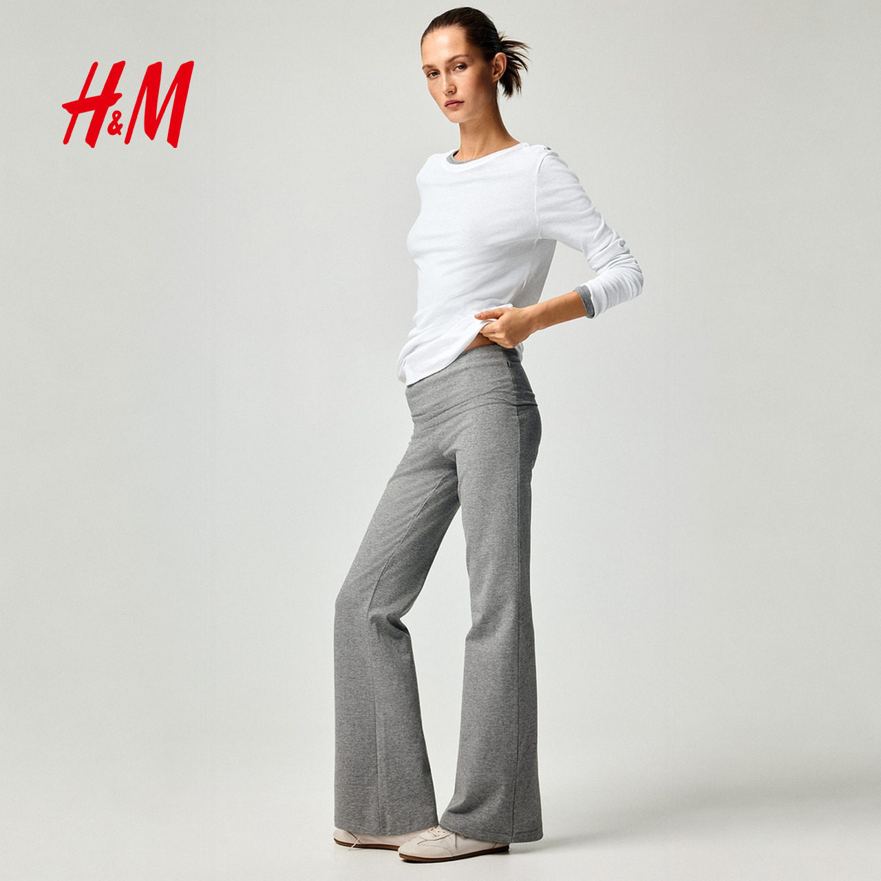 HM女装裤子春季通勤时尚休闲折叠腰棉质松紧腰外出长裤1299682