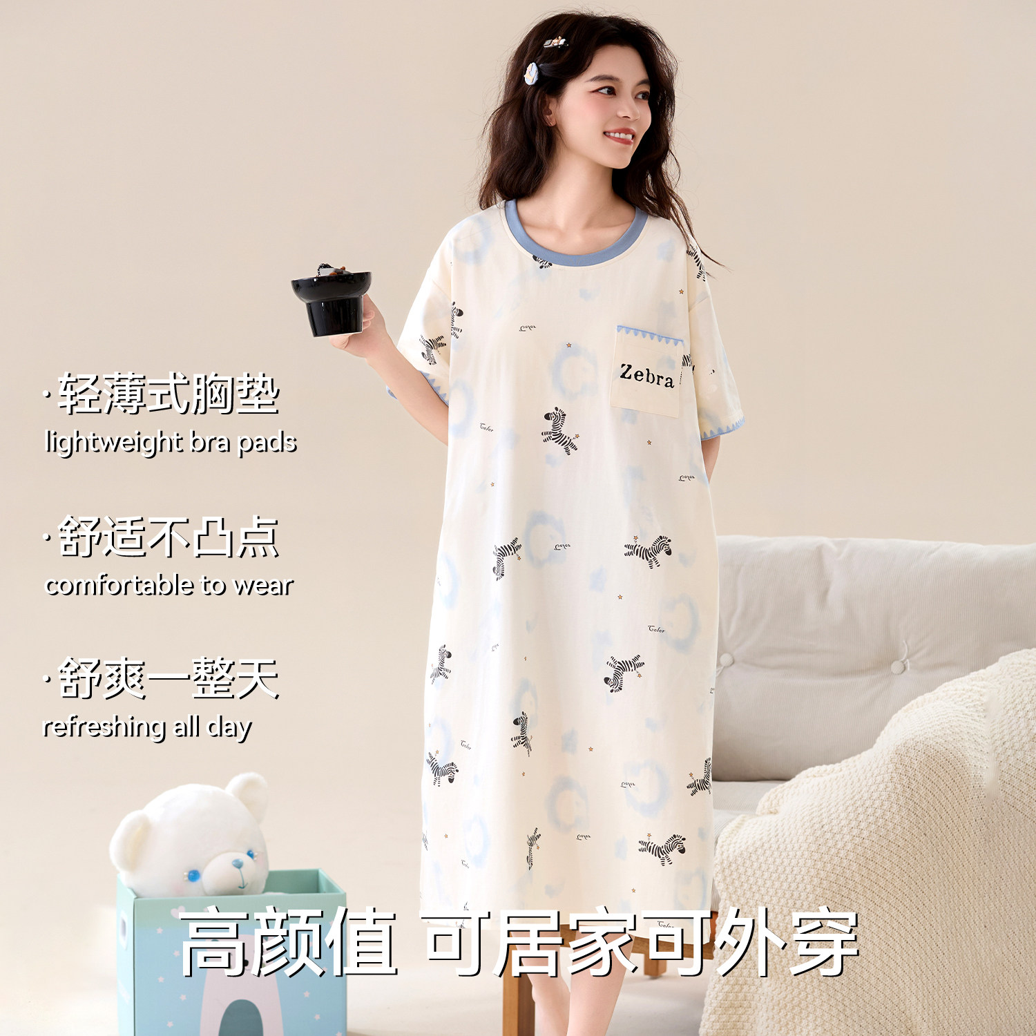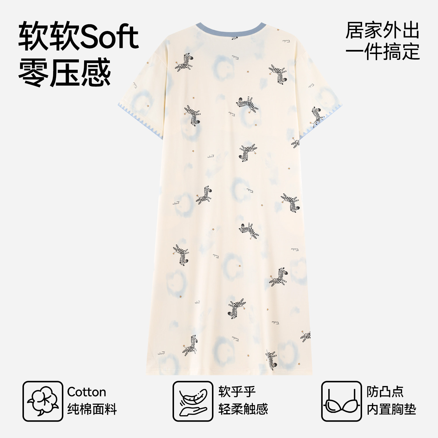 都市丽人睡裙女夏季短袖纯棉自带胸垫睡衣裙少女卡通可爱风外穿
