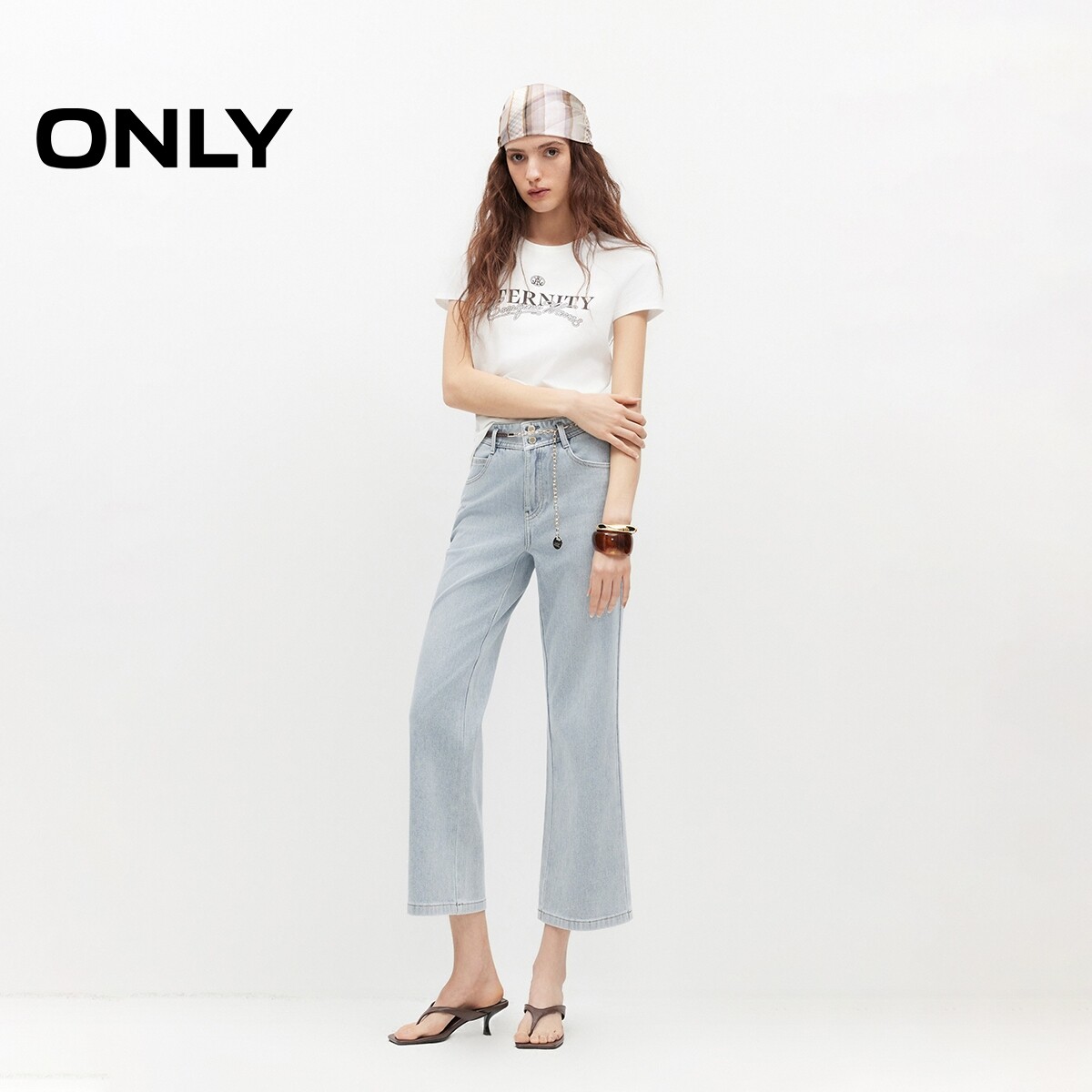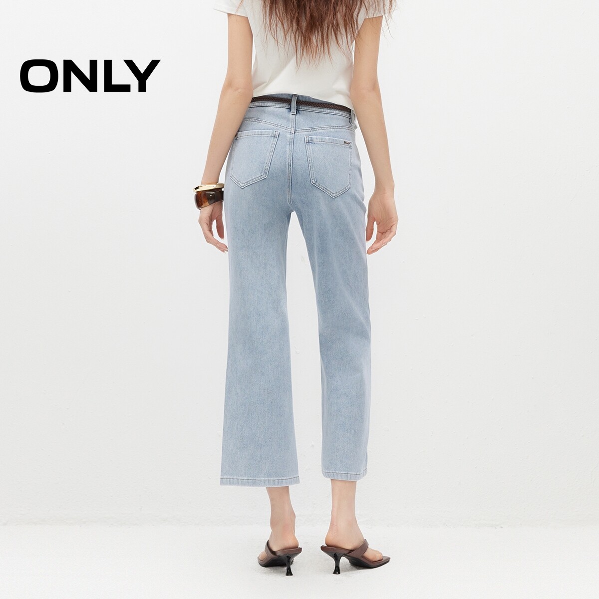 ONLY2026春季新款优雅通勤水洗腰链装饰浅蓝色微喇裤九分牛仔裤女