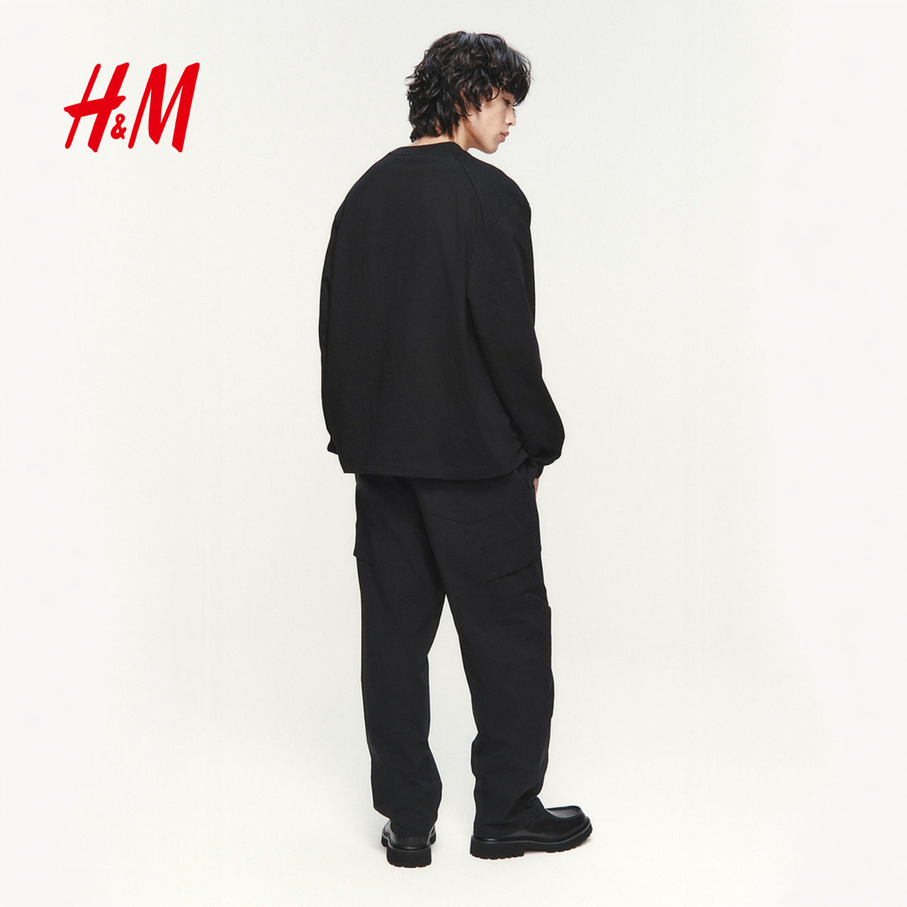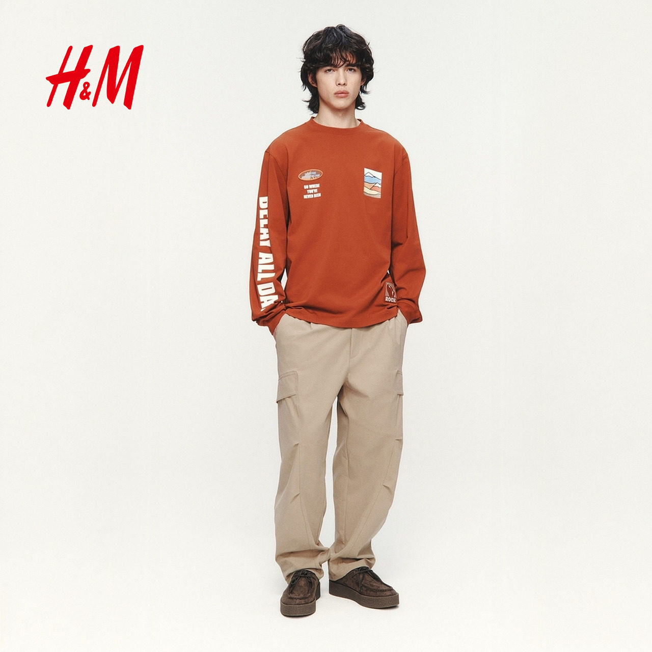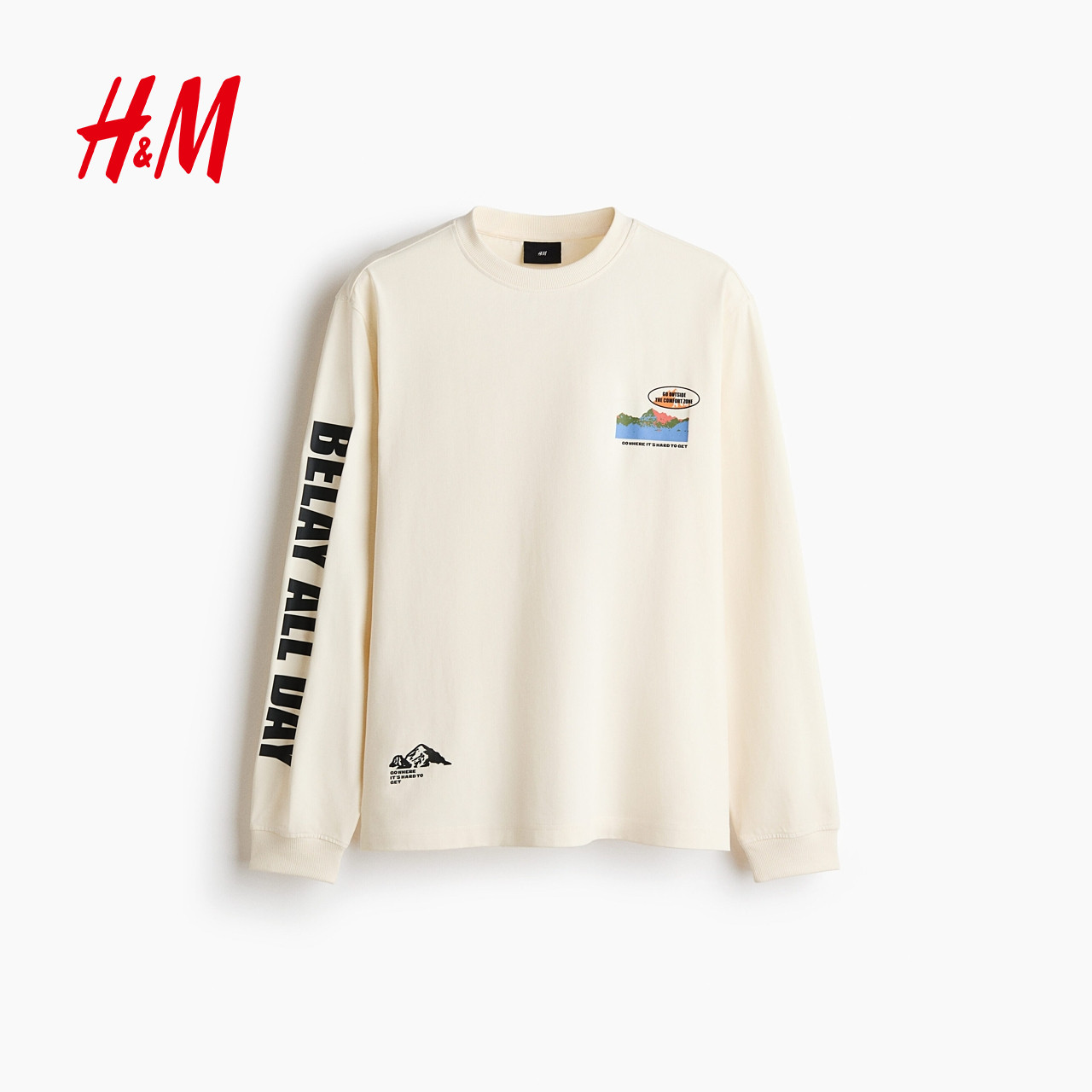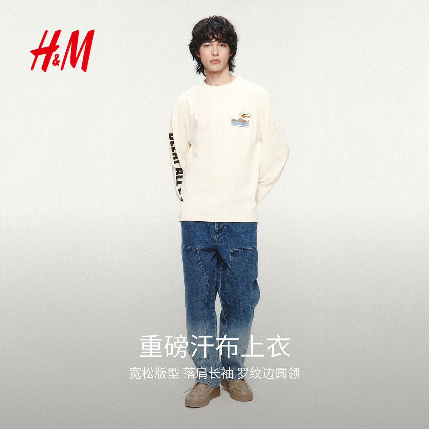 HM男装女装T恤2026春季新款印花圆领美式宽松长袖上衣重磅1326425