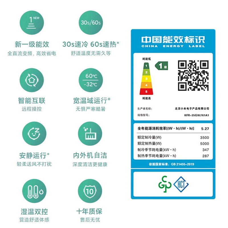 【国补20%】小米空调巨省电大1.5匹一级能效冷暖两用变频家用挂机