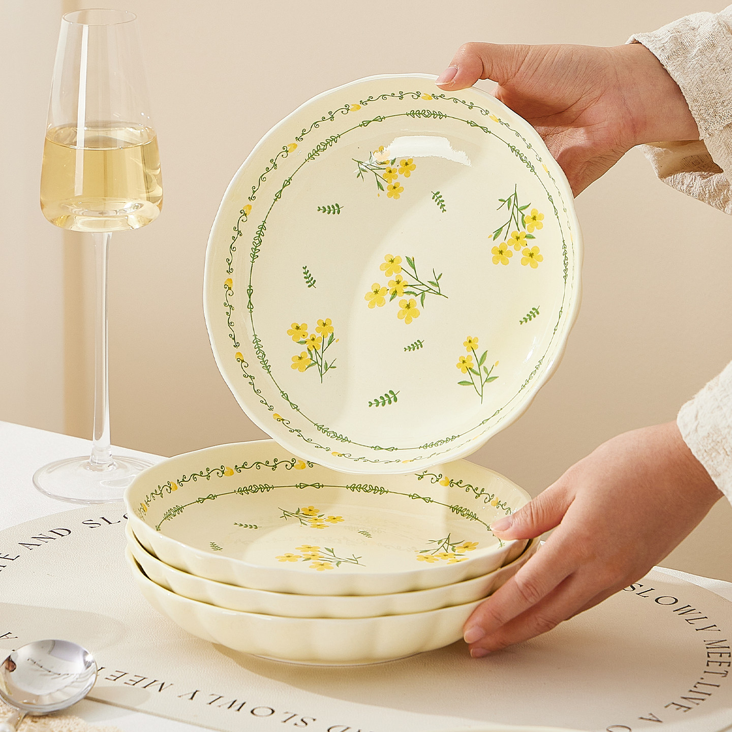 奶油风陶瓷碗家用卡通菜盘子可爱米饭碗汤碗釉下彩儿童餐具耐高温