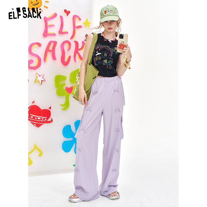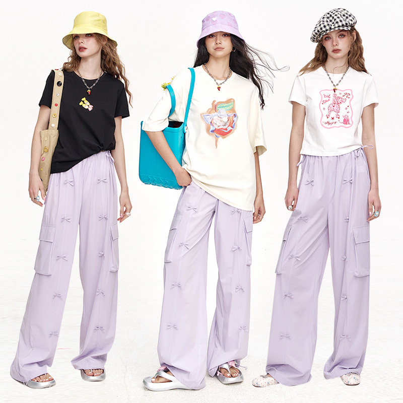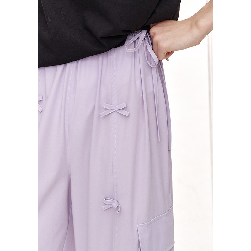 妖精的口袋紫色蝴蝶结工装风阔腿裤女2025年夏季新款宽松休闲裤子