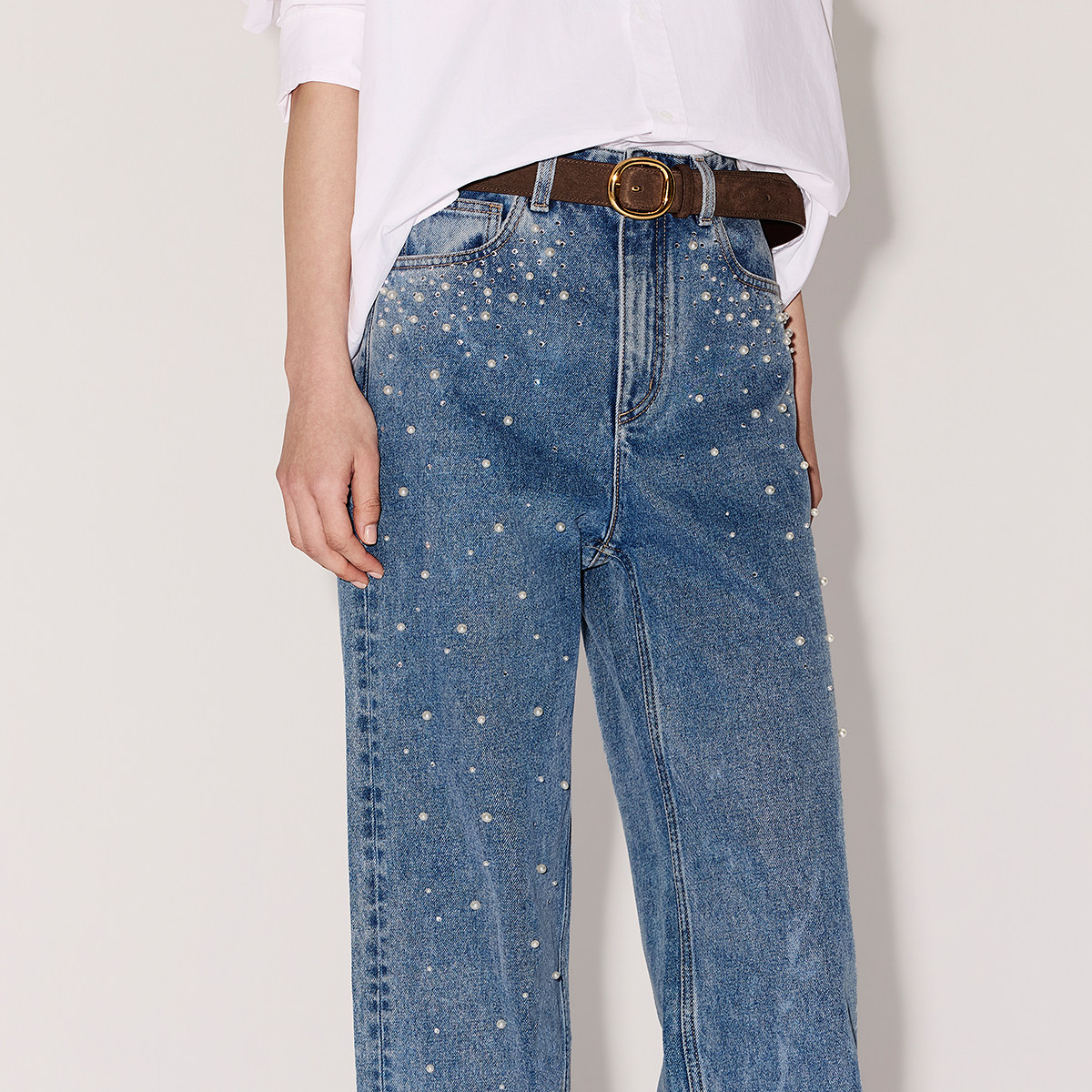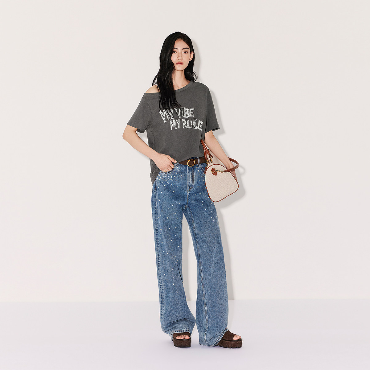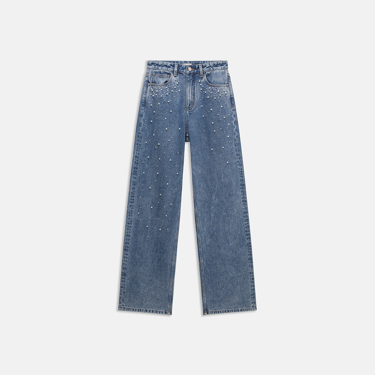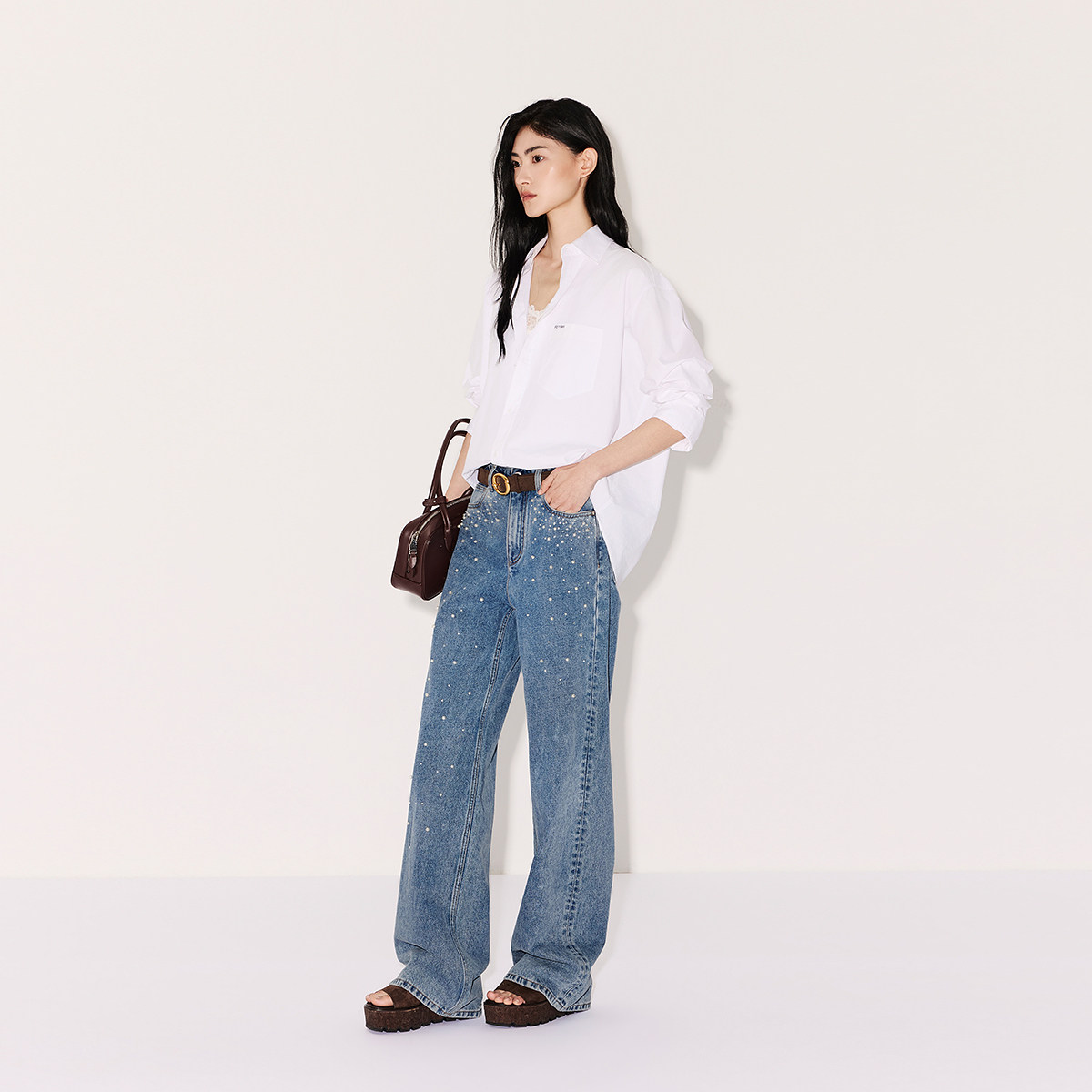 【新品】OCHIRLY欧时力 牛仔裤2026春烫钻珍珠开骨工艺直筒超模裤