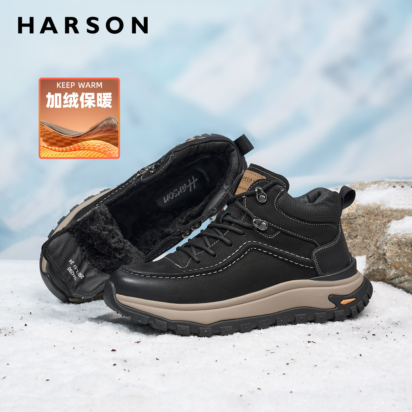 哈森冬季男鞋户外运动保暖雪地靴真皮加绒短靴子厚底防滑爸爸棉鞋
