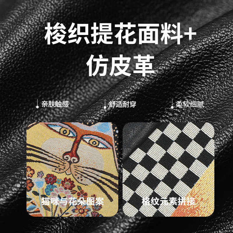 妖精的口袋格纹拼接猫咪仿pu皮短裙女2025冬季新款a字设计感裙子