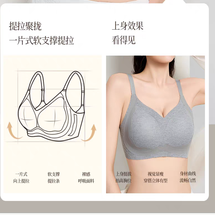 润微提拉女王内衣女大胸显小无痕大码调整防下垂收副乳粉底液文胸