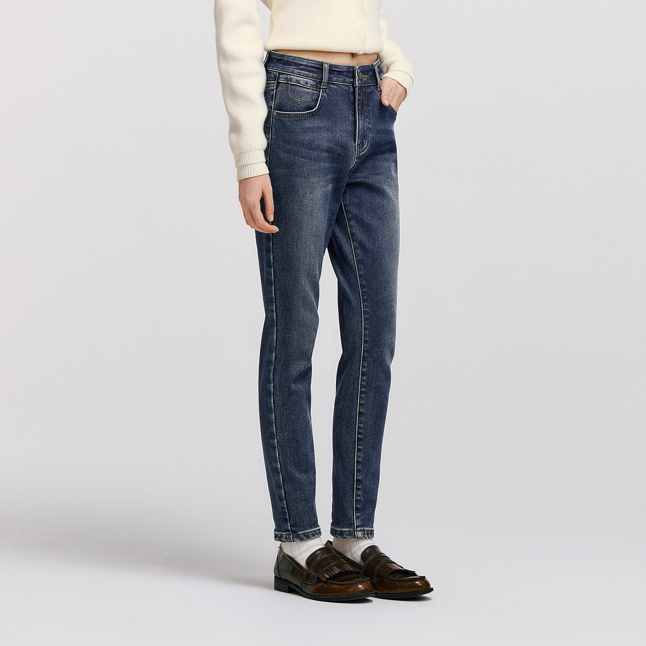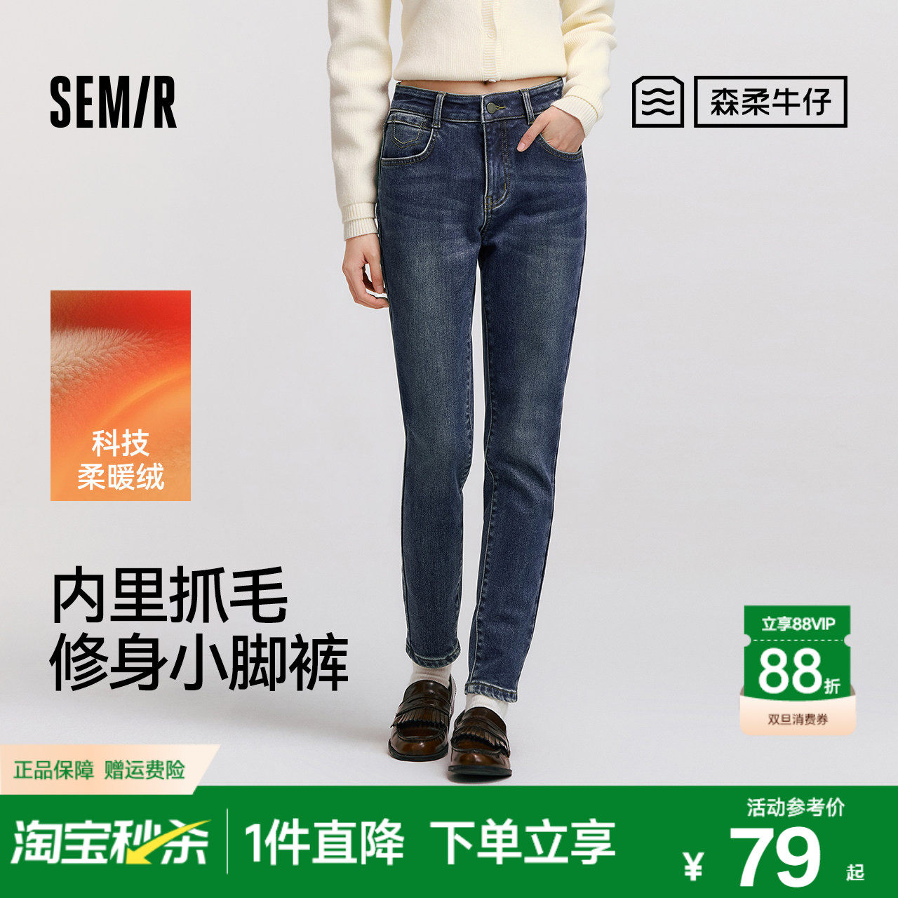 森柔|森马牛仔裤女冬季修身抓毛小脚裤显瘦舒适韩版休闲潮流长裤