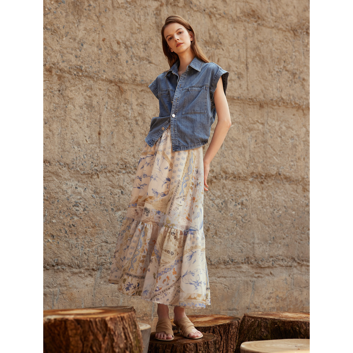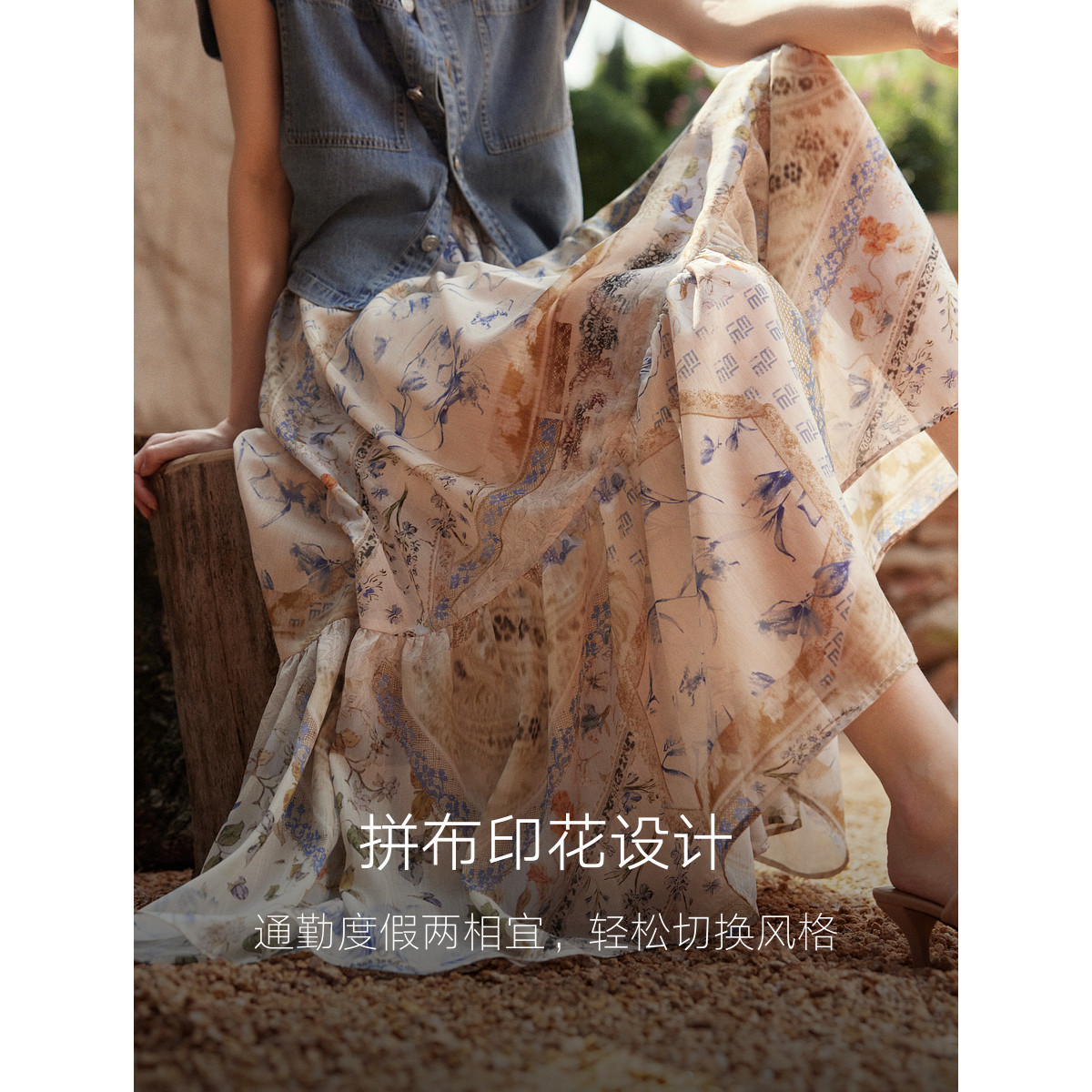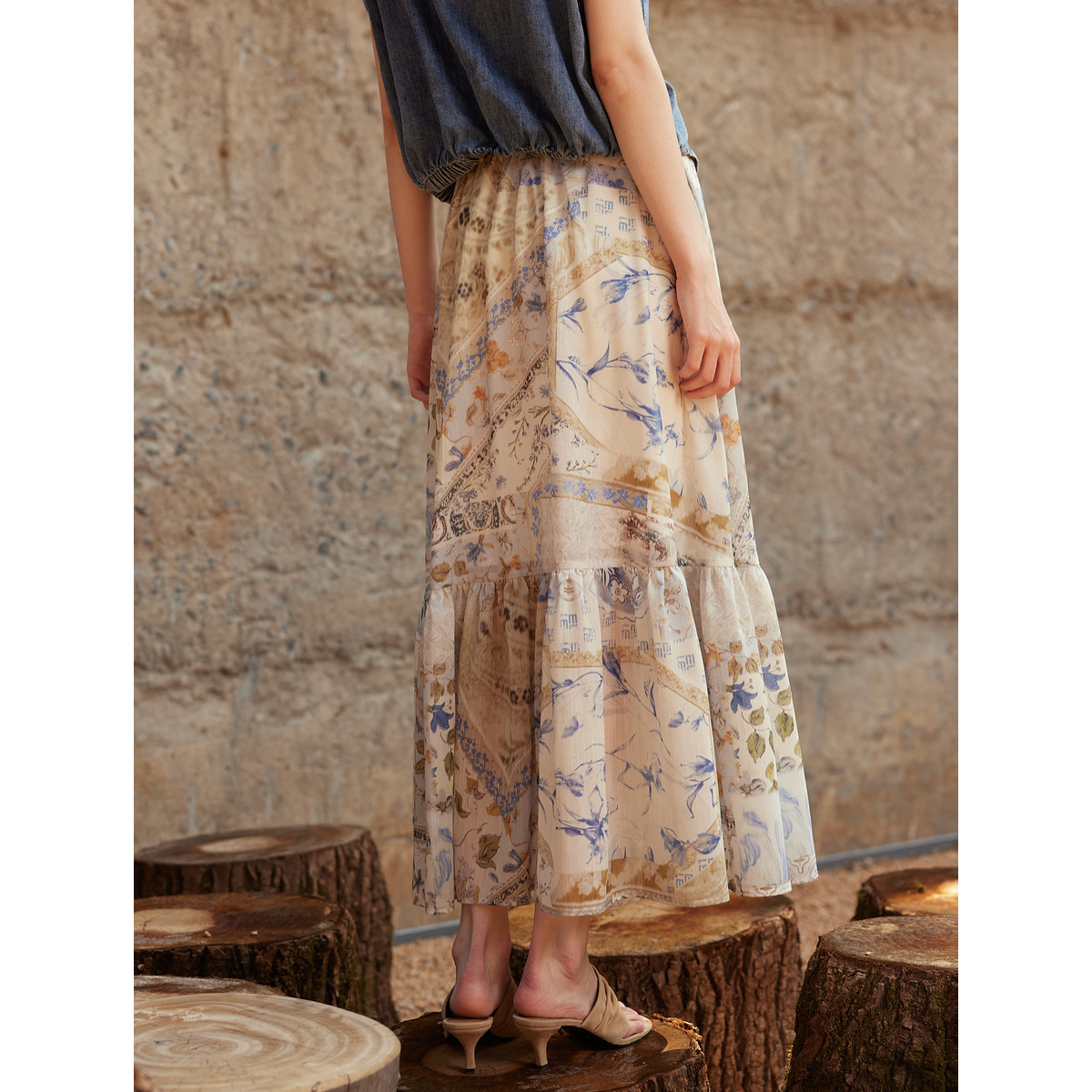 ELLE复古度假风半身裙女2025夏季新款波嬉印花高腰显瘦伞裙蛋糕裙