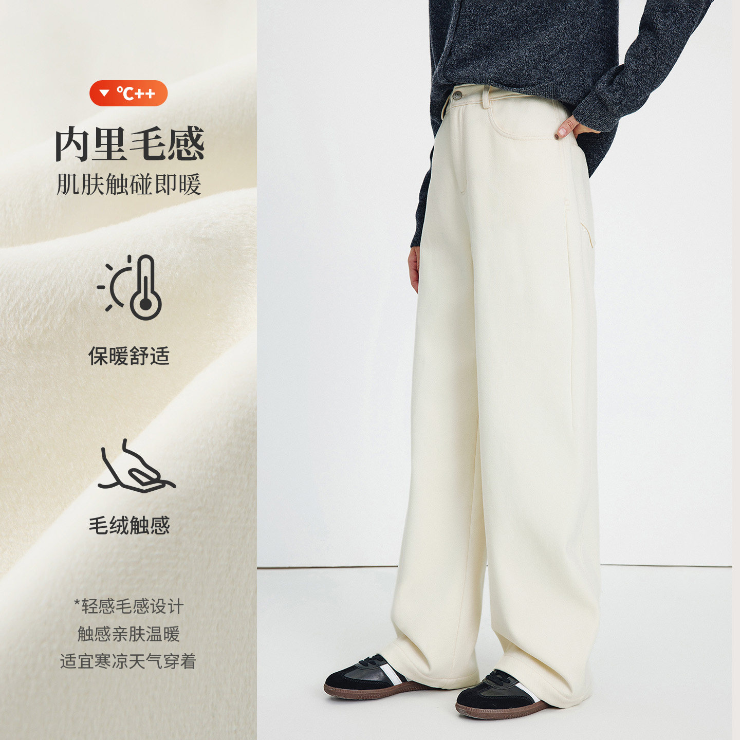 森马牛仔裤女冬抓毛莱赛尔阔腿裤2025新款白色拖地裤蓝色流行高腰