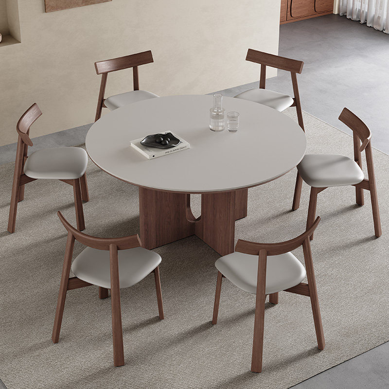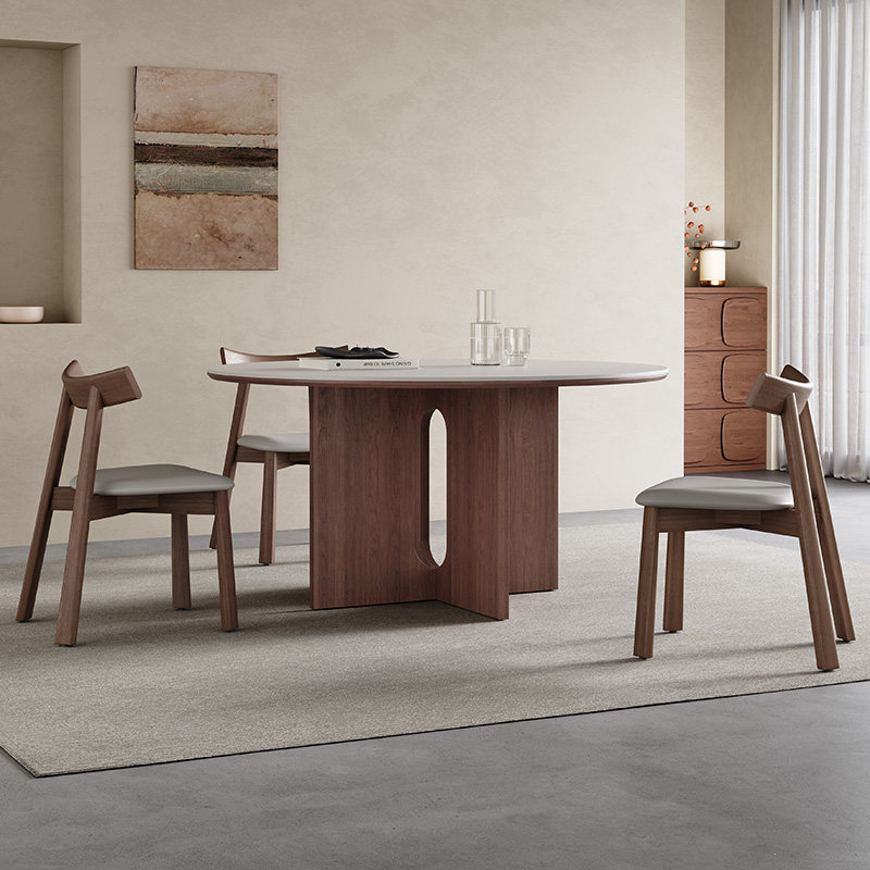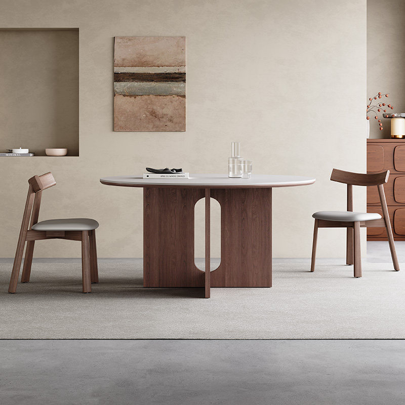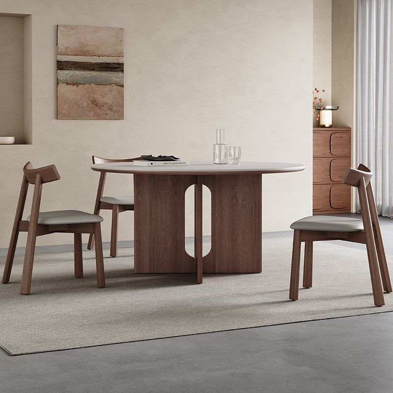 意式岩板餐桌圆形2025新款胡桃木色小户型中古风白色岩板餐桌圆桌