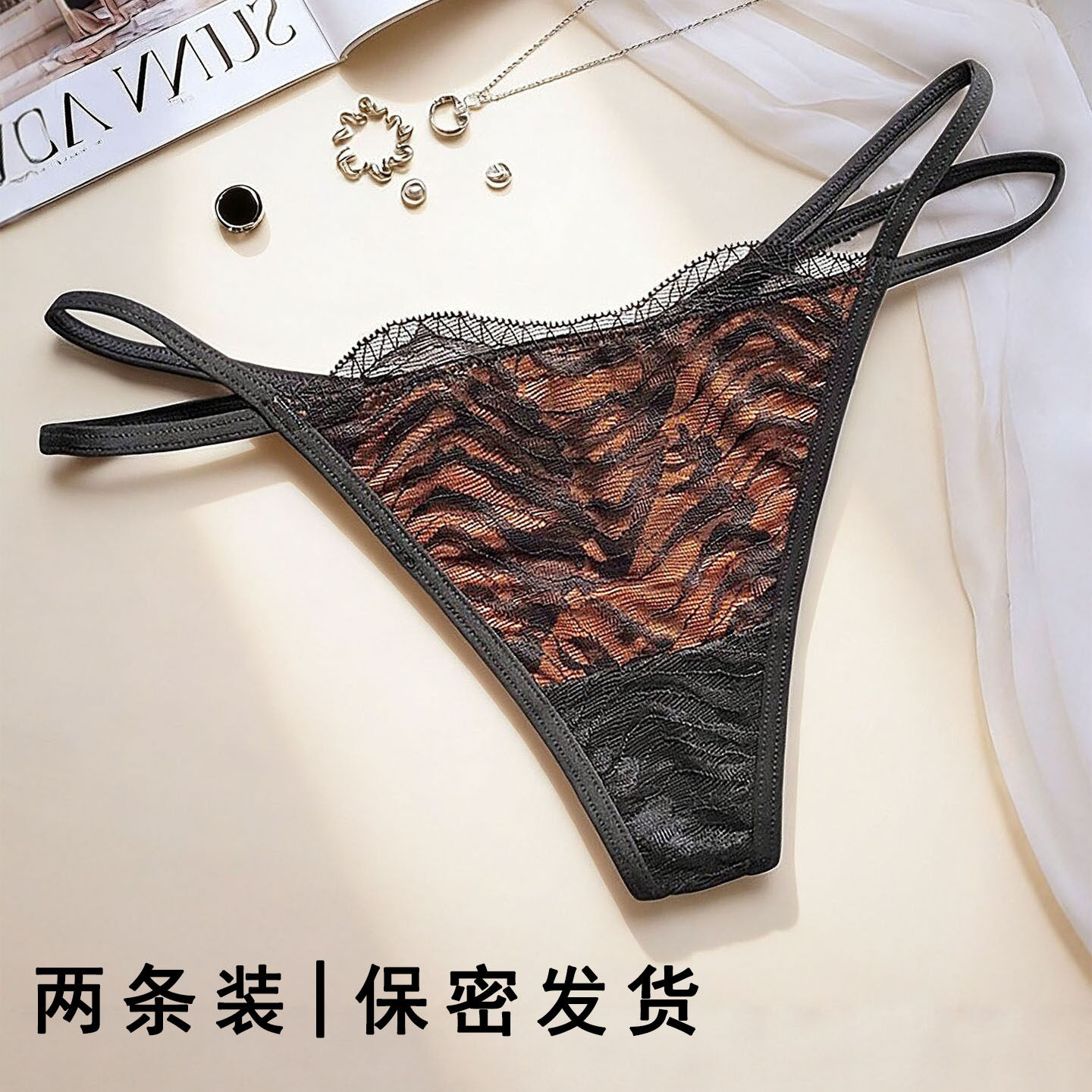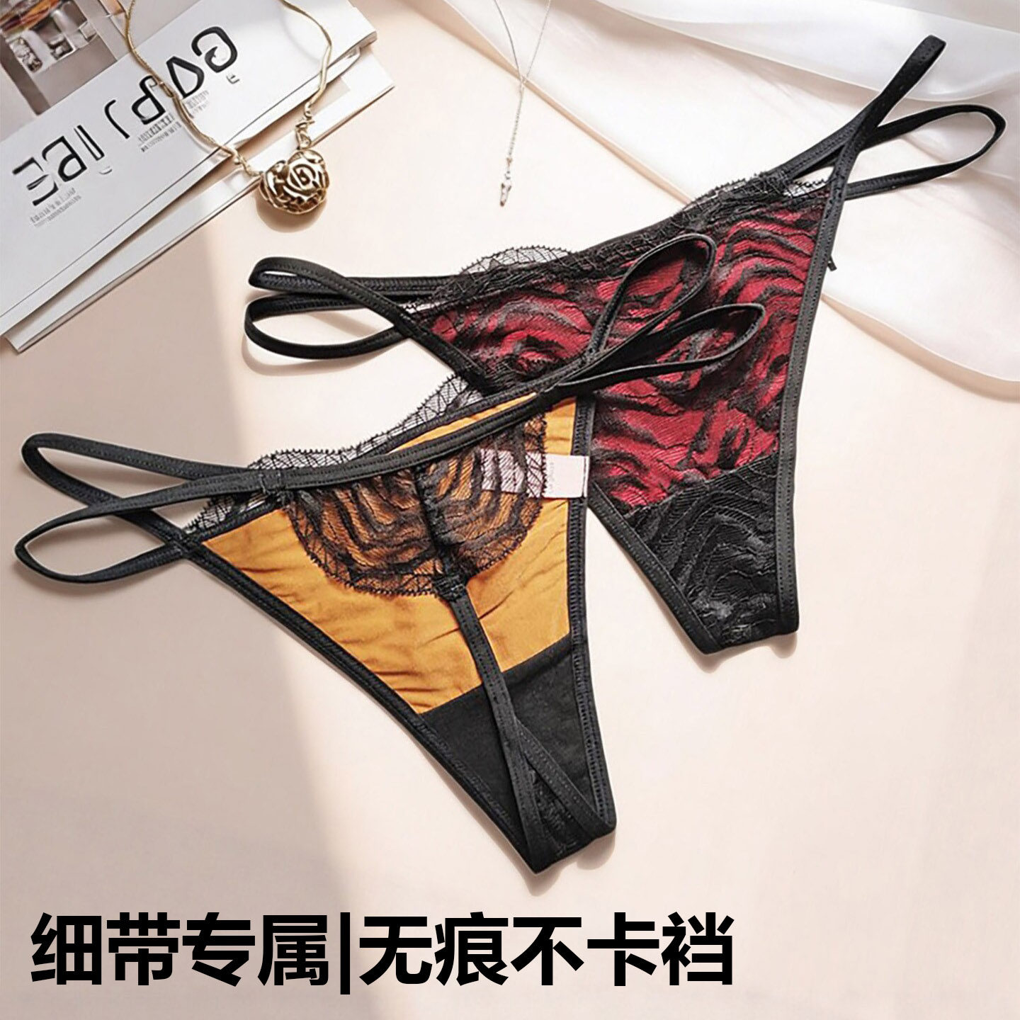丁字裤女士蕾丝低腰 纯欲风双细带 纯棉裆舒适性感隐形T裤 2条装