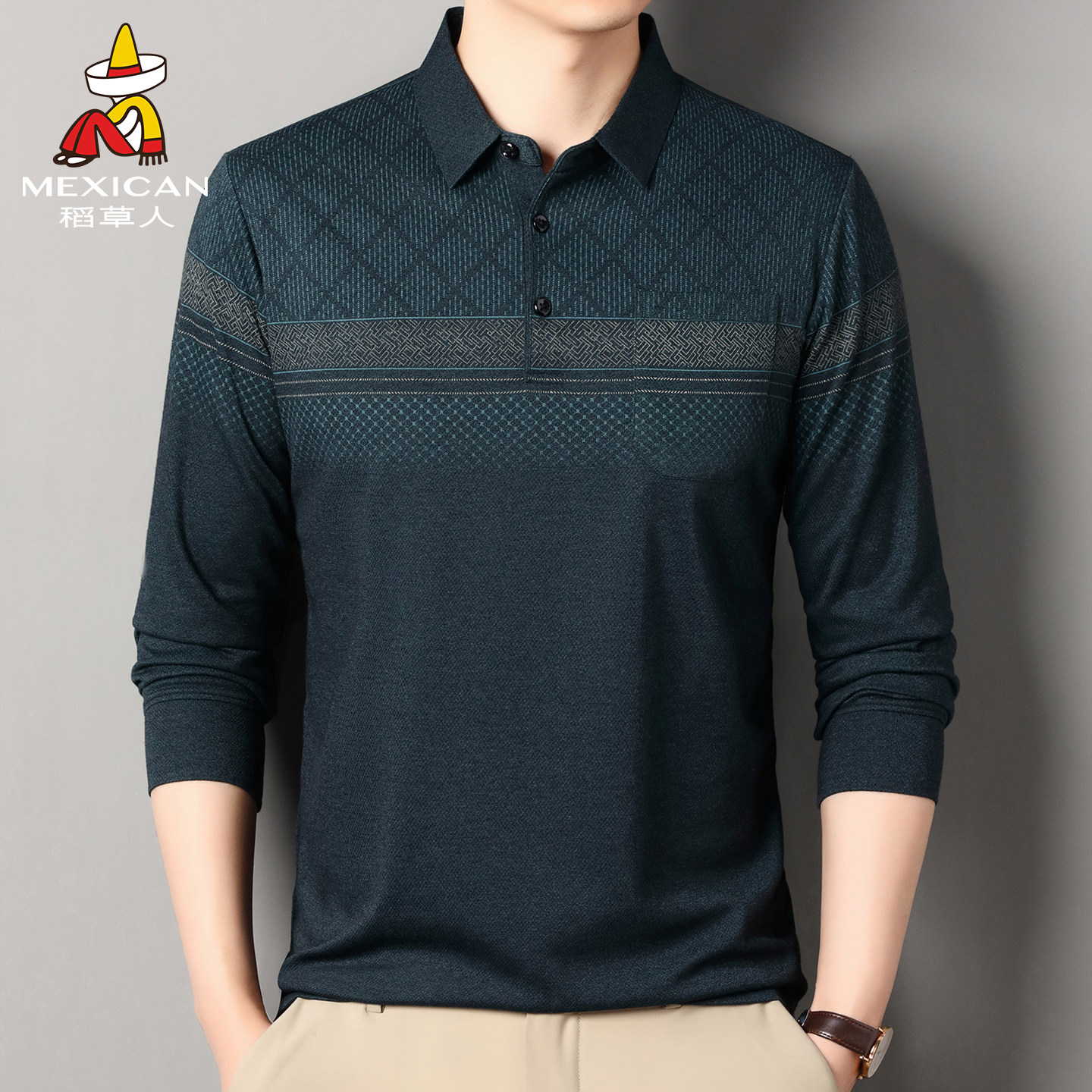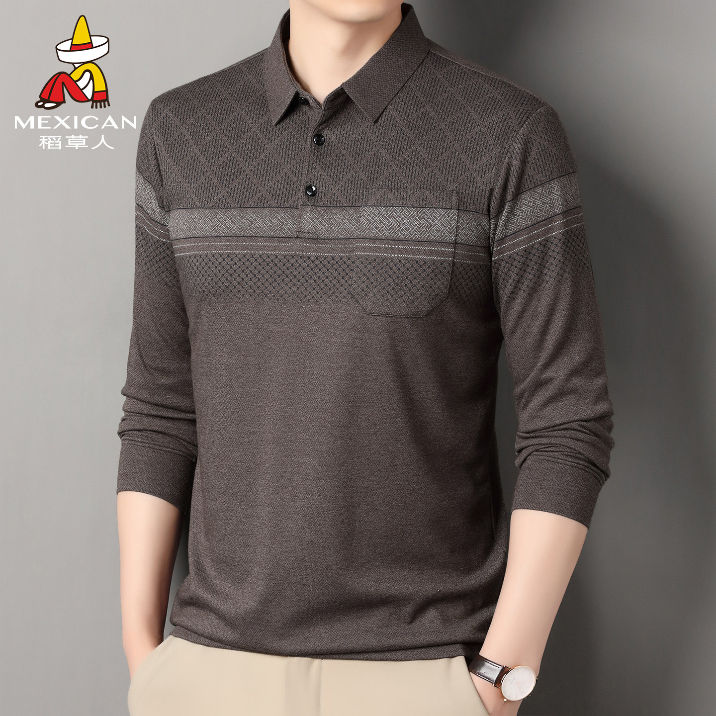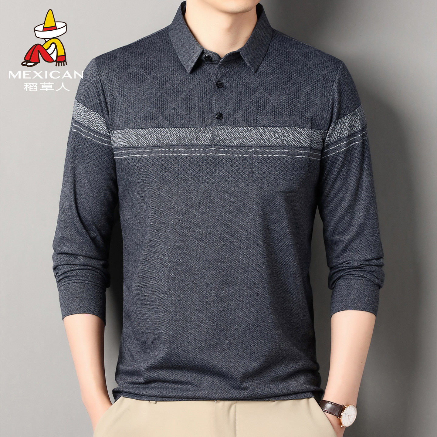 稻草人长袖t恤男宽松翻领条纹上衣春秋新款中年休闲POLO衫爸爸装J