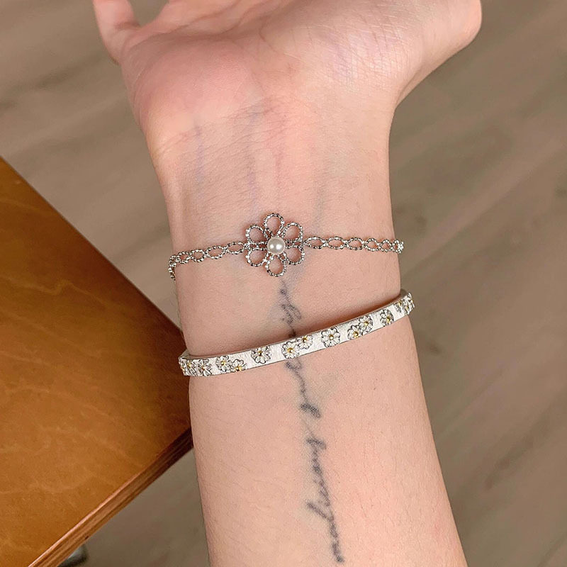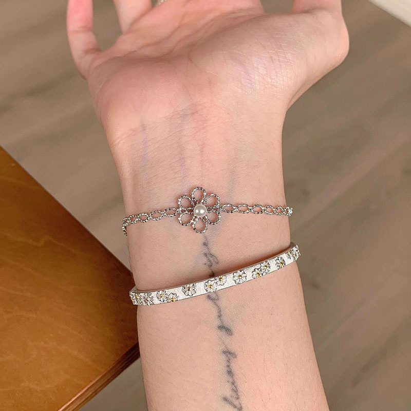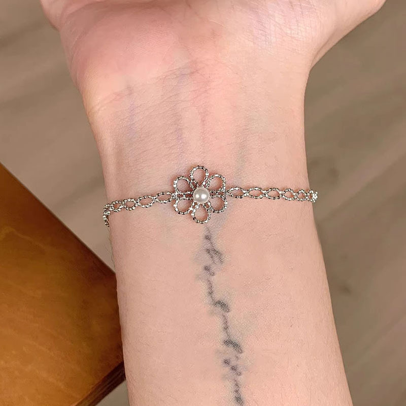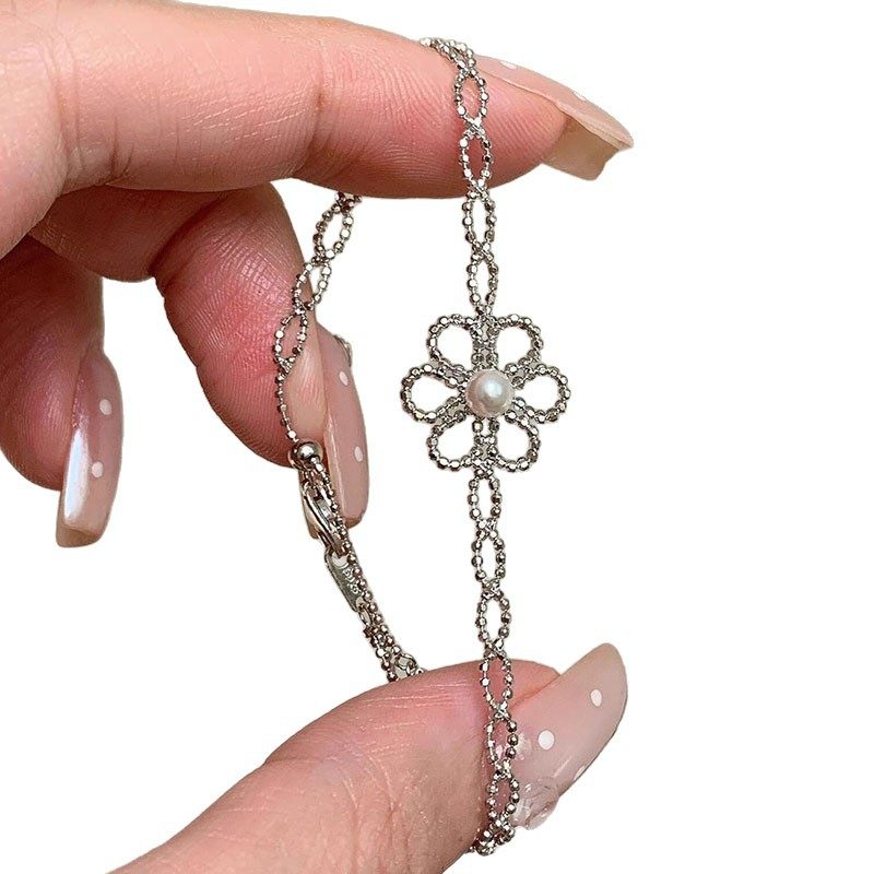 中古银色蕾丝花朵珍珠手链精致简约时尚高颜值设计轻奢叠戴手饰品