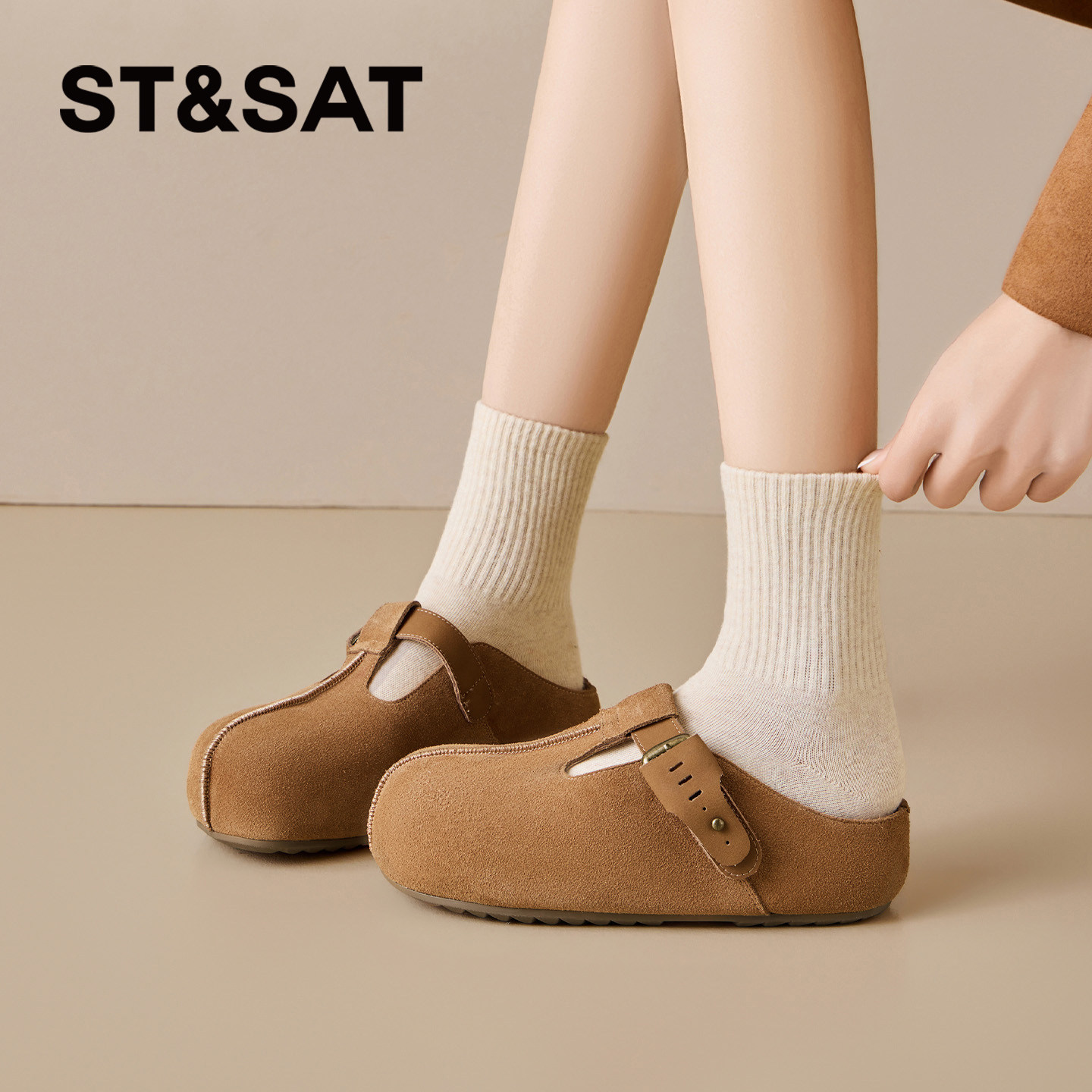 叁叔家~内增高勃肯鞋女加绒秋冬保暖毛毛半拖外穿厚底博肯鞋