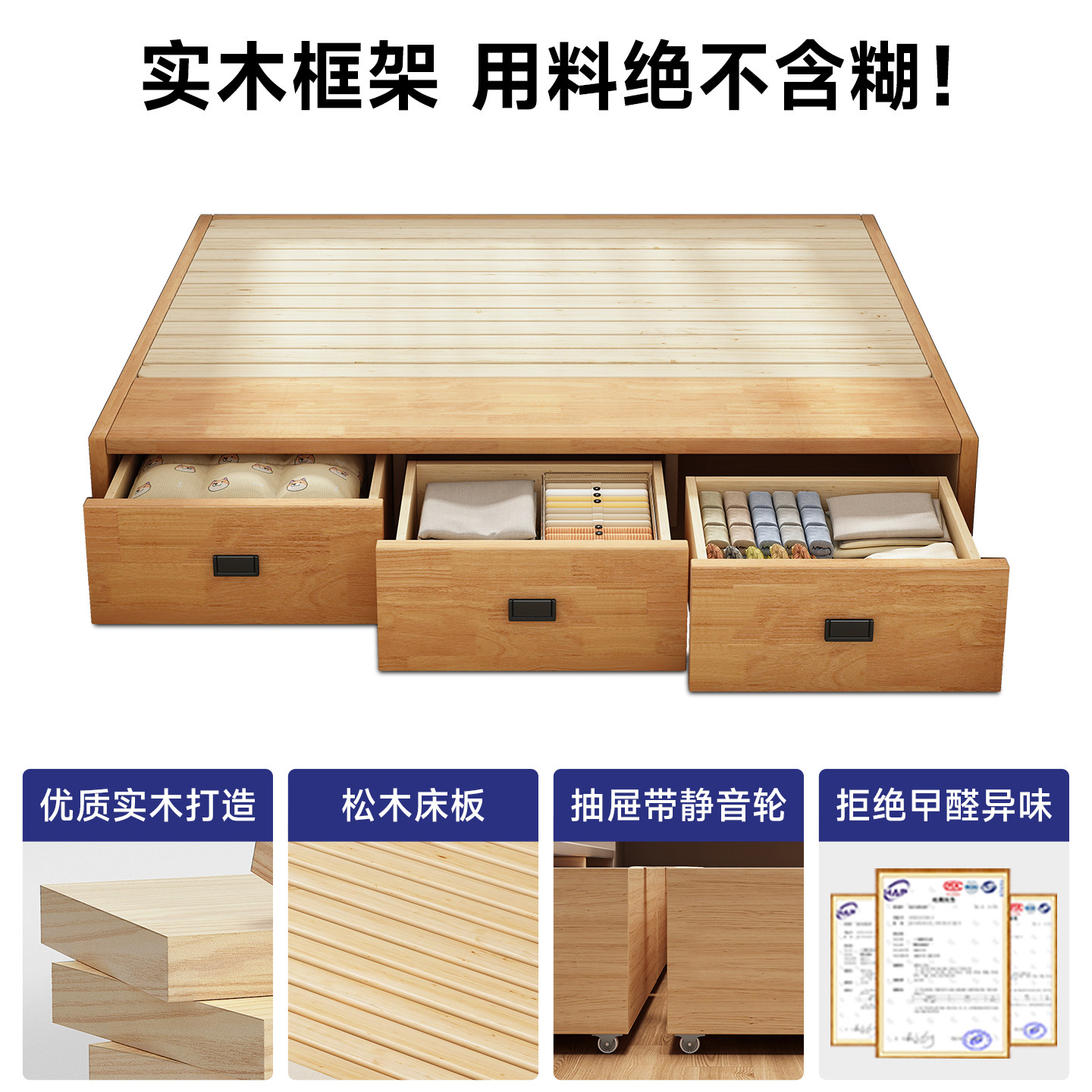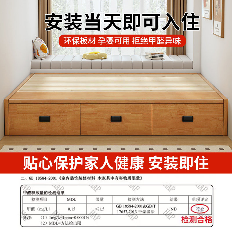全实木无床头榻榻米小户型双人床卧室三抽储物落地床可支持定制