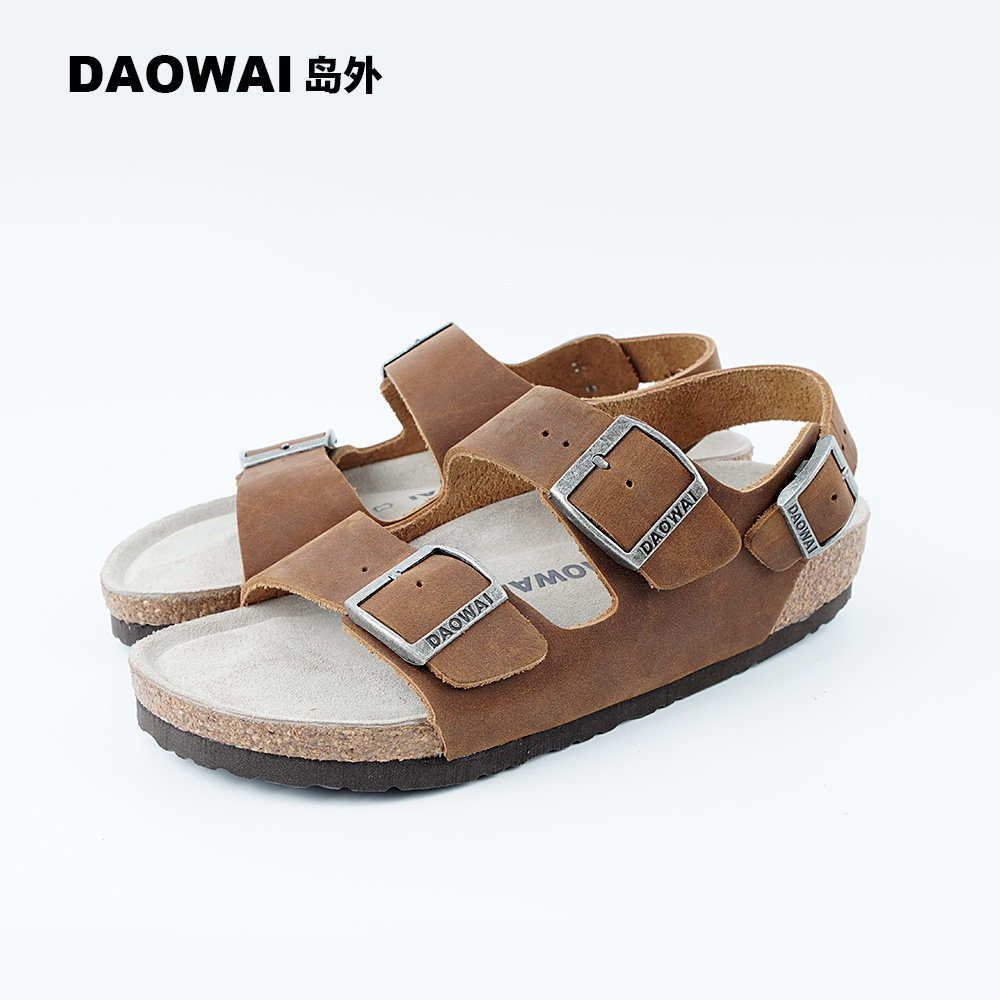 岛外DAOWAI勃肯鞋夏季一字带扣软木凉鞋真牛皮休闲博肯鞋男女