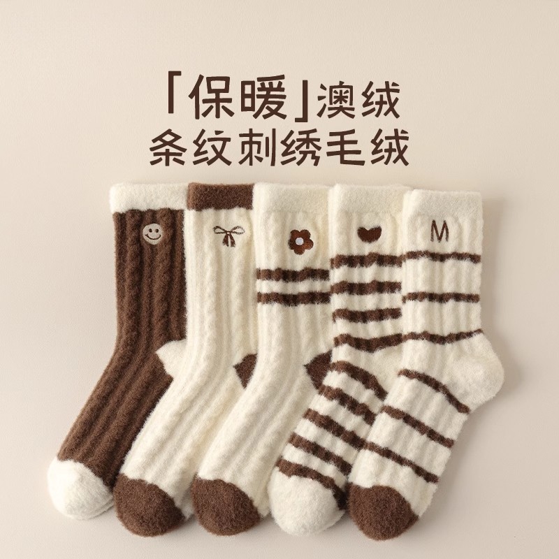 澳绒袜子女中筒袜加厚保暖加绒长袜居家睡眠月子袜地板袜冬季毛绒