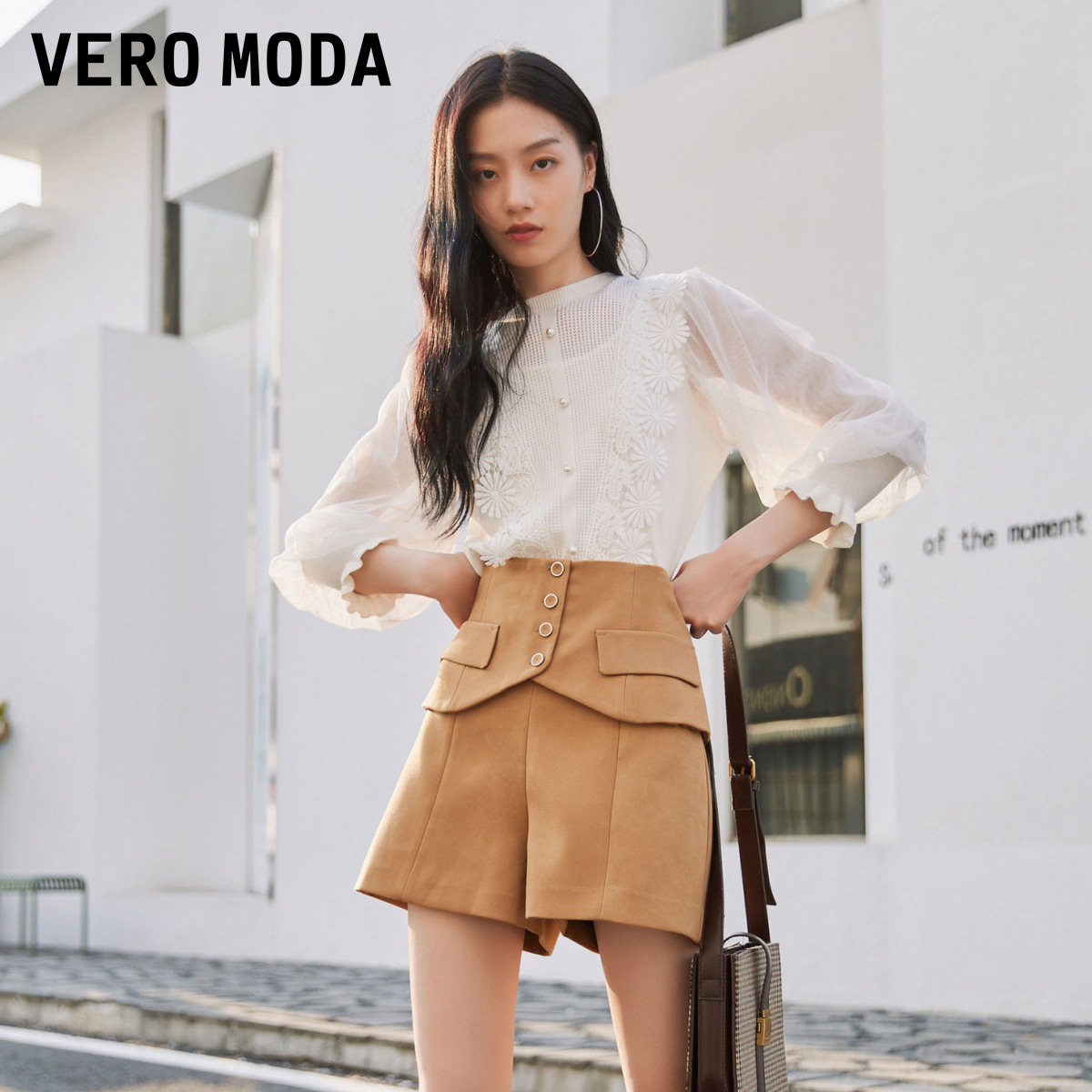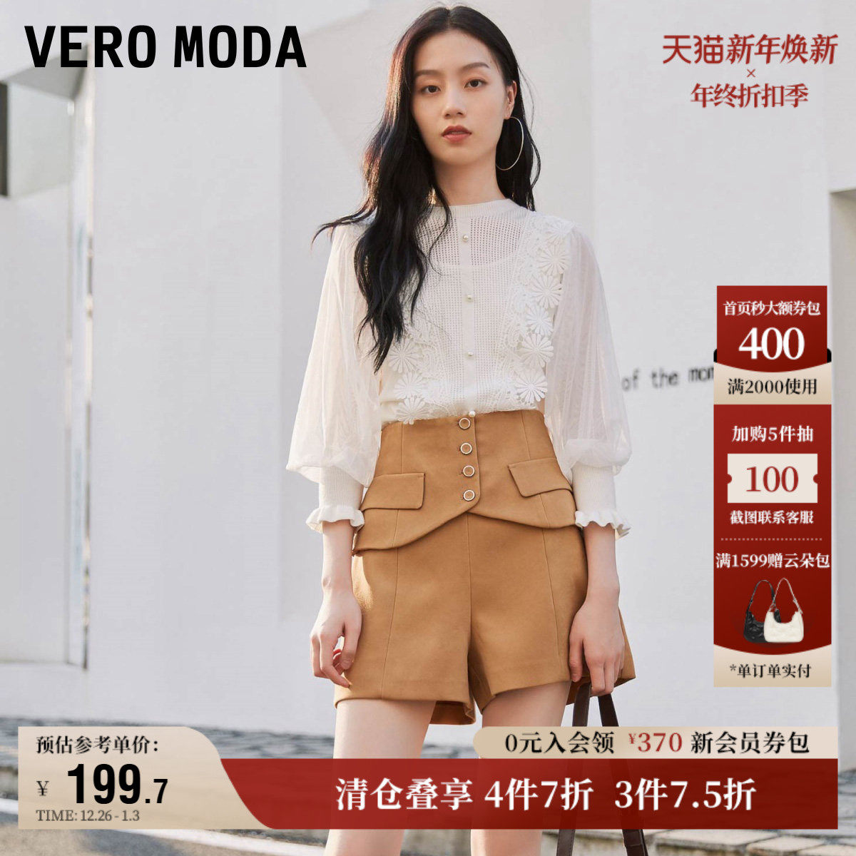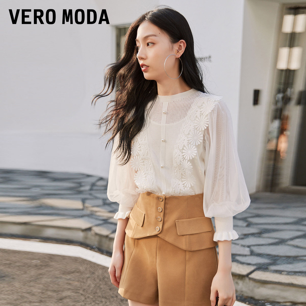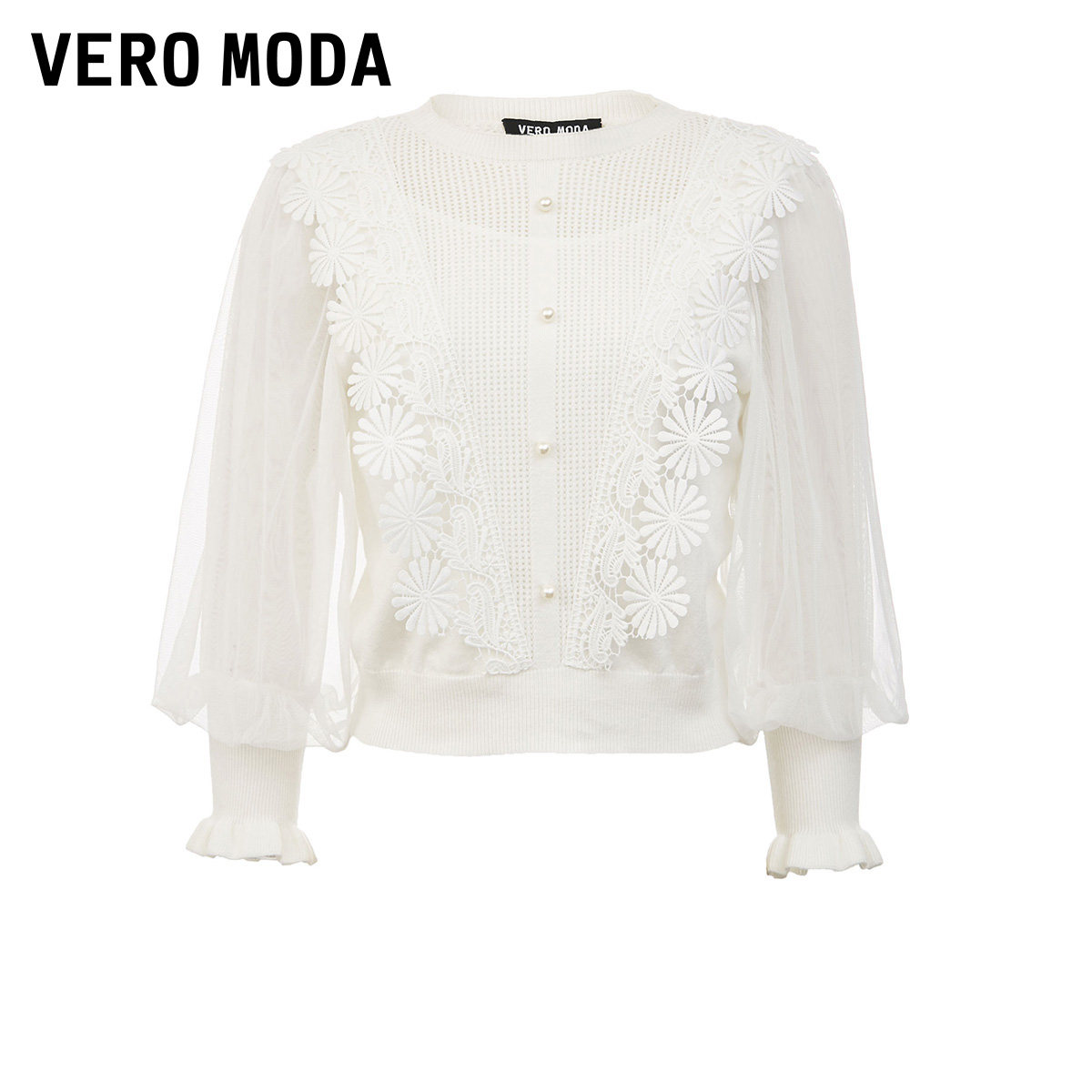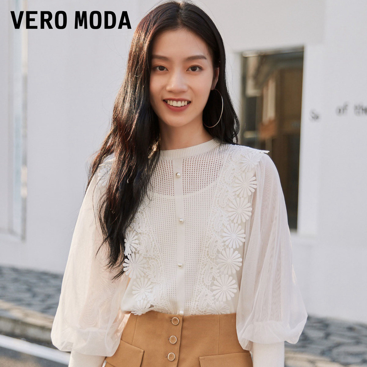 Vero Moda奥莱针织衫毛衣女秋季新款拼接蕾丝网纱泡泡袖上衣流行