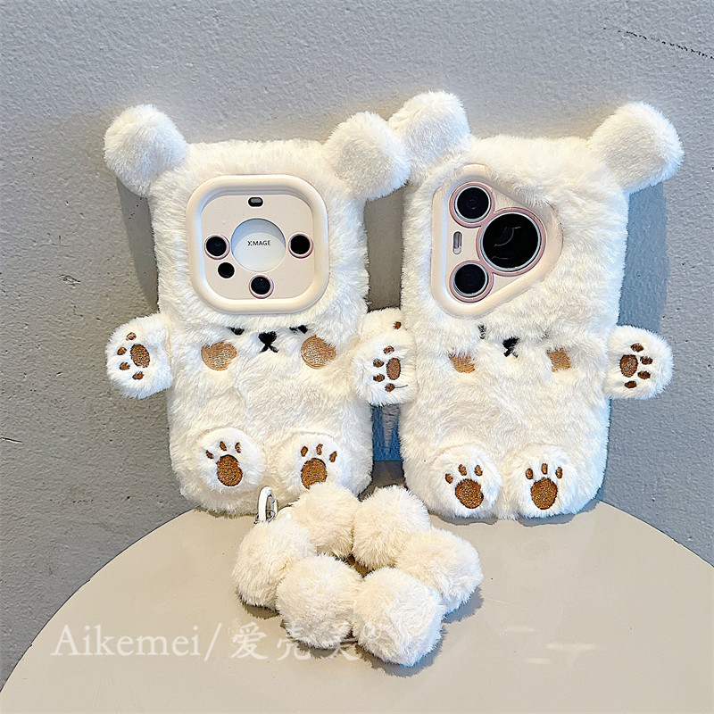适用华为pura70pro+壳p60pro秋冬ins毛绒可爱卡通腮红小熊P70Ultra毛茸茸手环p50pro全包防摔mate60pro女