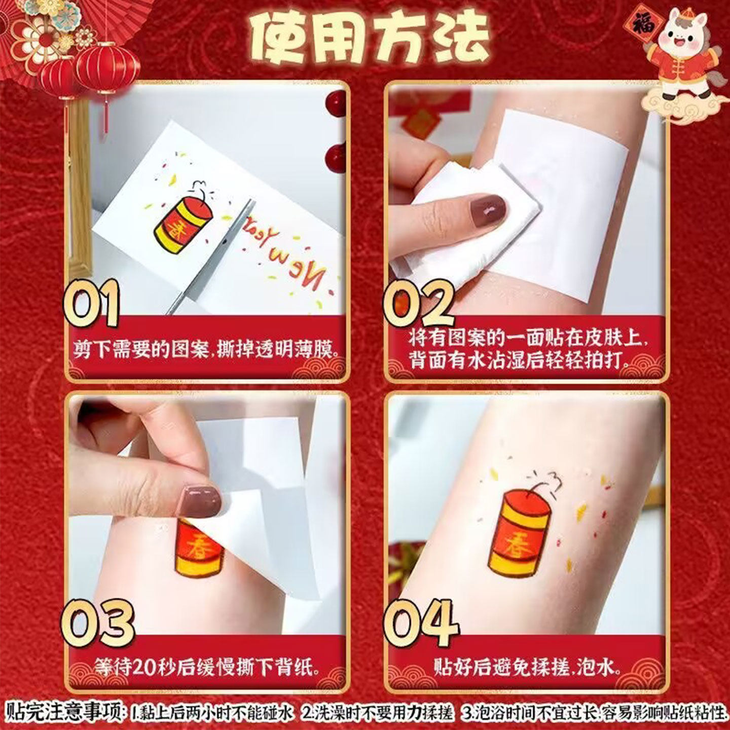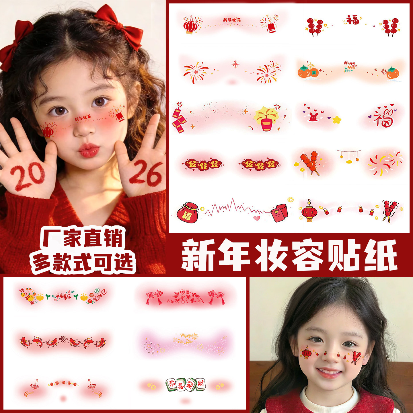 新年儿童贴纸纹身妆容贴小女孩喜庆新春拜年脸部装饰烟花糖葫芦女童宝宝过年写真拍照全家福化妆贴面部彩绘贴